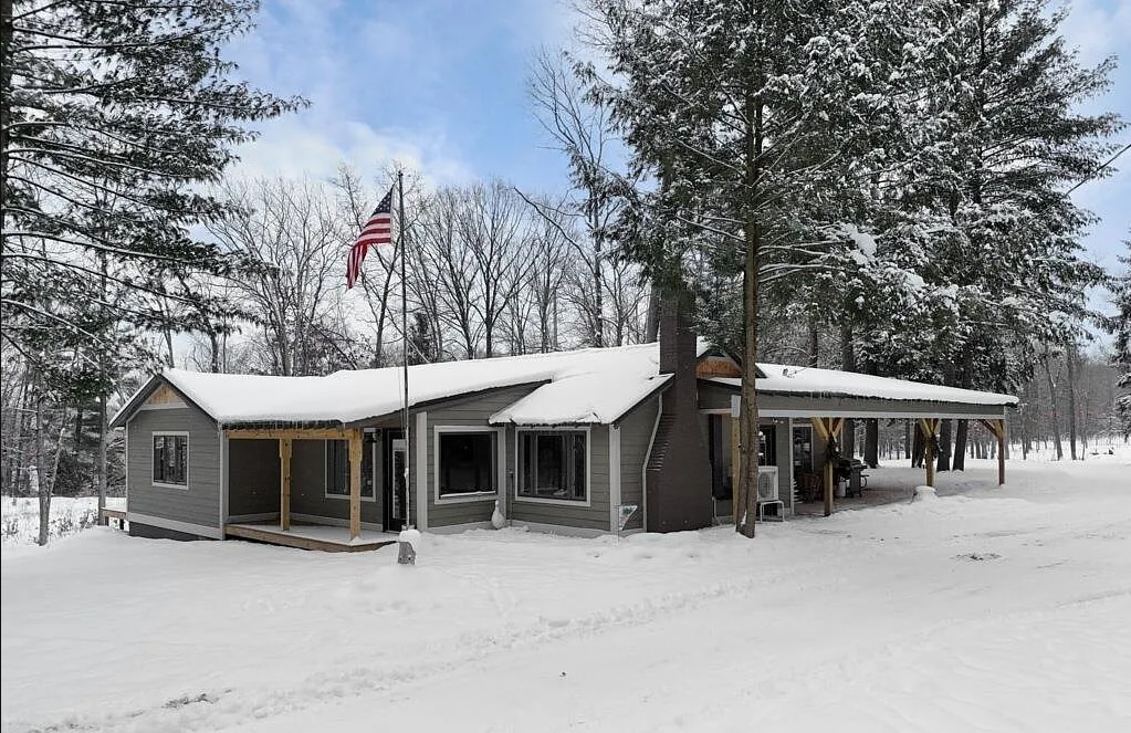 3 dormitorios y 1,5 casas de campo tienen sala de estar de planta abierta, comedor y cocina. La bañera de hidromasaje en la puerta corrediza del baño en la planta superior tiene una gran terraza en el segundo piso para disfrutar de la belleza del bosque detrás de la casa. Conducción circular para acomodar tus remolques de motos de nieve/corredores de olas. La cubierta superior ofrece refugio para descargar tu equipo o sombra para disfrutar del hermoso aire libre.