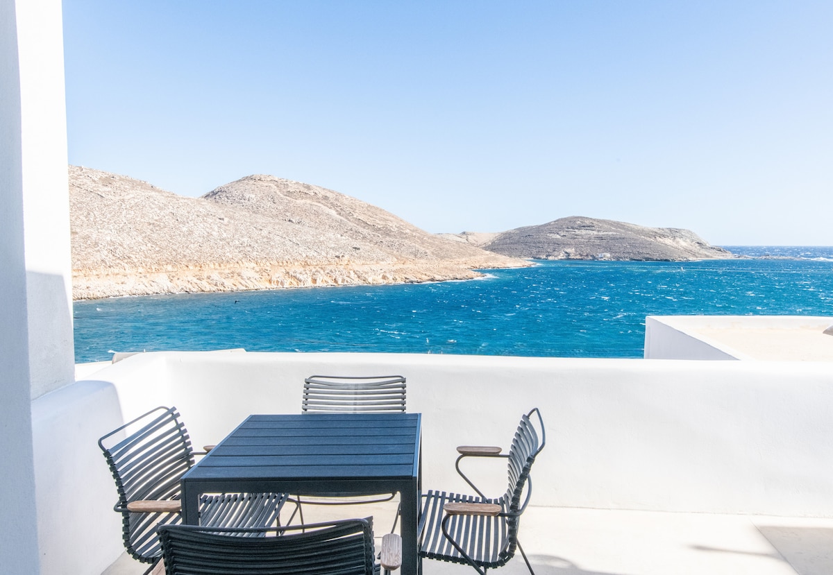 Vista al mar con terraza privada >Tamaño: 40 m² Terraza privada con vistas ilimitadas al mar | Camas: 1 tamaño king | 1 sofá cama | Baño Pequeña cocina equipada - pantería - máquina de café - comedor | TV satelital i Conexión inalámbrica a Internet de banda ancha Sistema de aire acondicionado (calefacción y refrigeración) en todas las habitaciones Refrigerador / congelador mediano Ropa de cama y toallas Famosos artículos de aseo naturales de marca Botiquín de primeros auxilios con secador de pelo Iluminación nocturna automática Comedor Baño