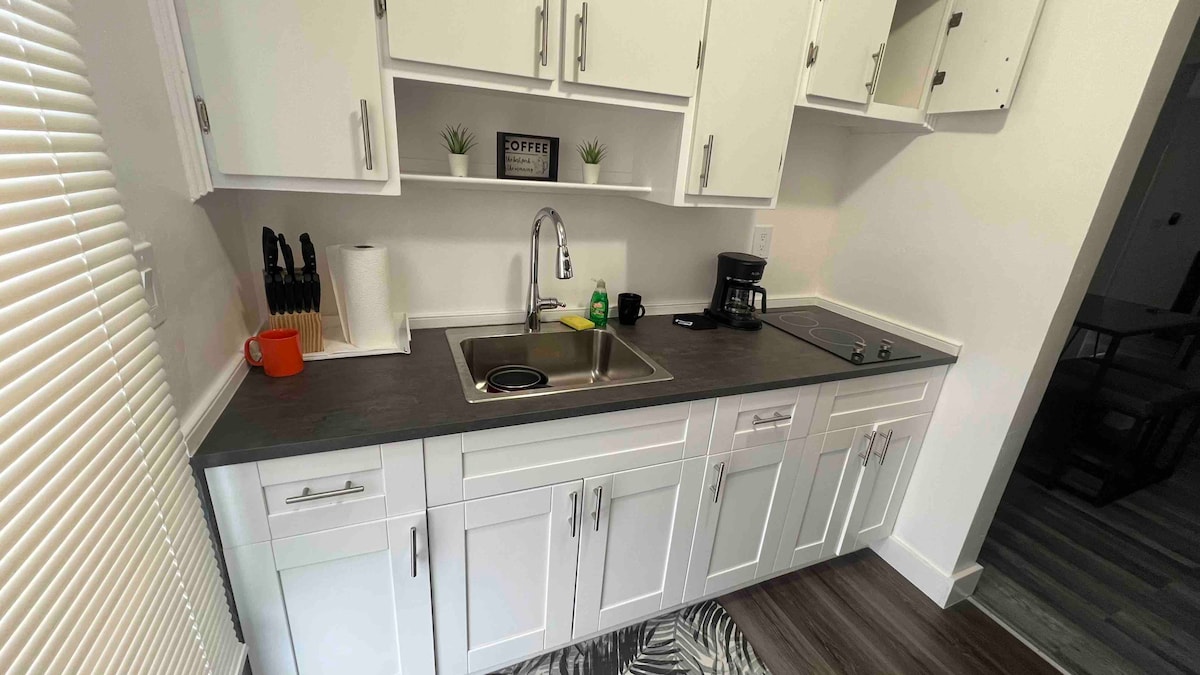 Este espacioso apartamento tipo estudio se encuentra a solo una manzana de la playa, equipado con dos sillas de playa y una sombrilla, una nevera portátil y una cocina completa que incluye cafetera, microondas y una placa de cocción de dos hornillas. También cuenta con una pequeña mesa de comedor y una cama tamaño queen. Wifi y TV inteligente incluidos para tu comodidad. Ten en cuenta que no hay aparcamiento privado y que puede ser difícil aparcar en la calle después del mediodía y los fines de semana.