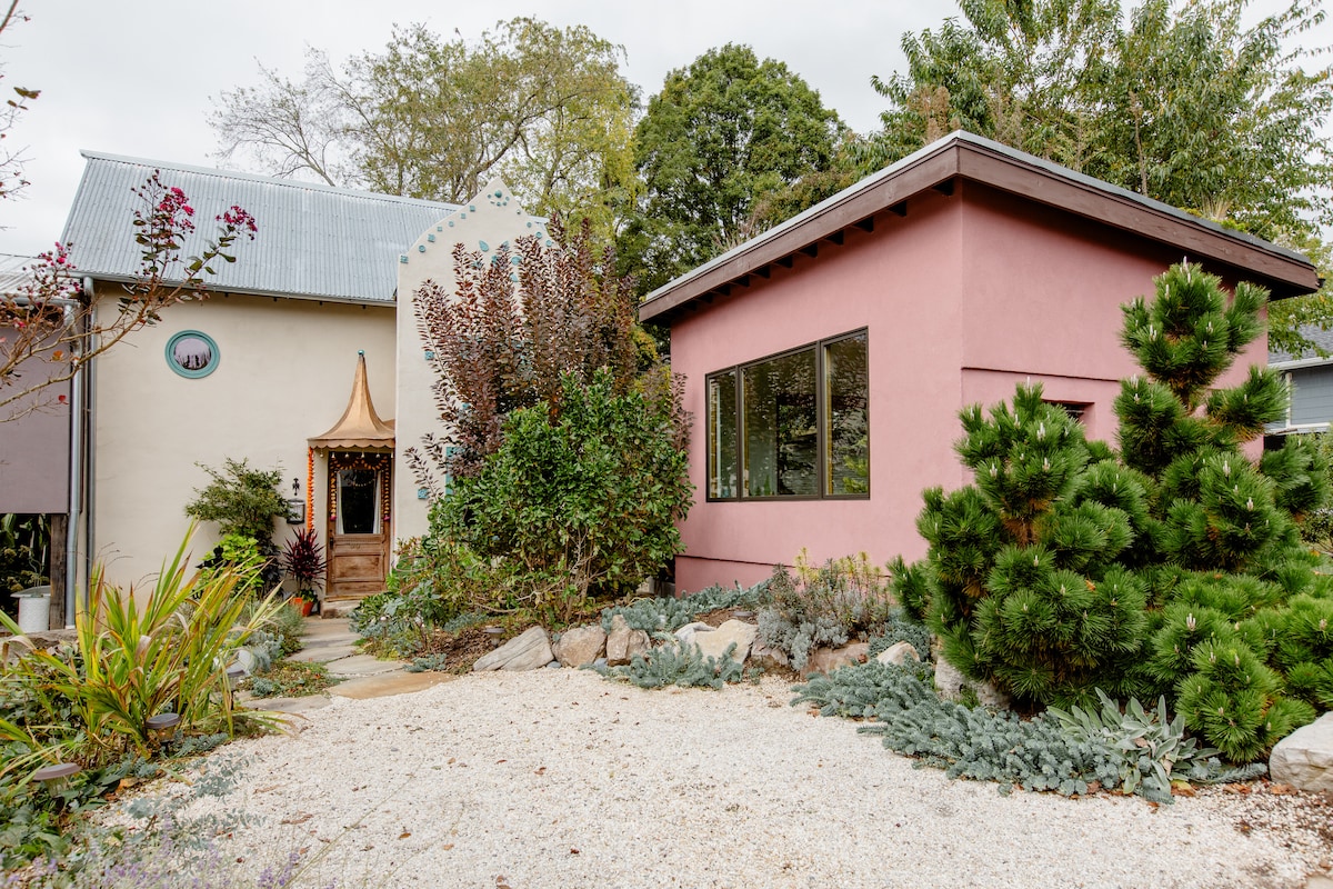 One of a kind artist owned and designed cottage in heart of East-West Asheville. Walkable to restaurants/shops, 2 miles from downtown and 5 minutes to Biltmore Estate. TWO beds total. The cottage has a Moroccan vibe and includes handmade pottery, art, and textiles. Walls are clay plaster and all bedding is cotton. Eco friendly cleaning supplies used. Try the outdoor tub for hot bath also! Parking is on Bradley street in front of the cottage or main house. Totally private.