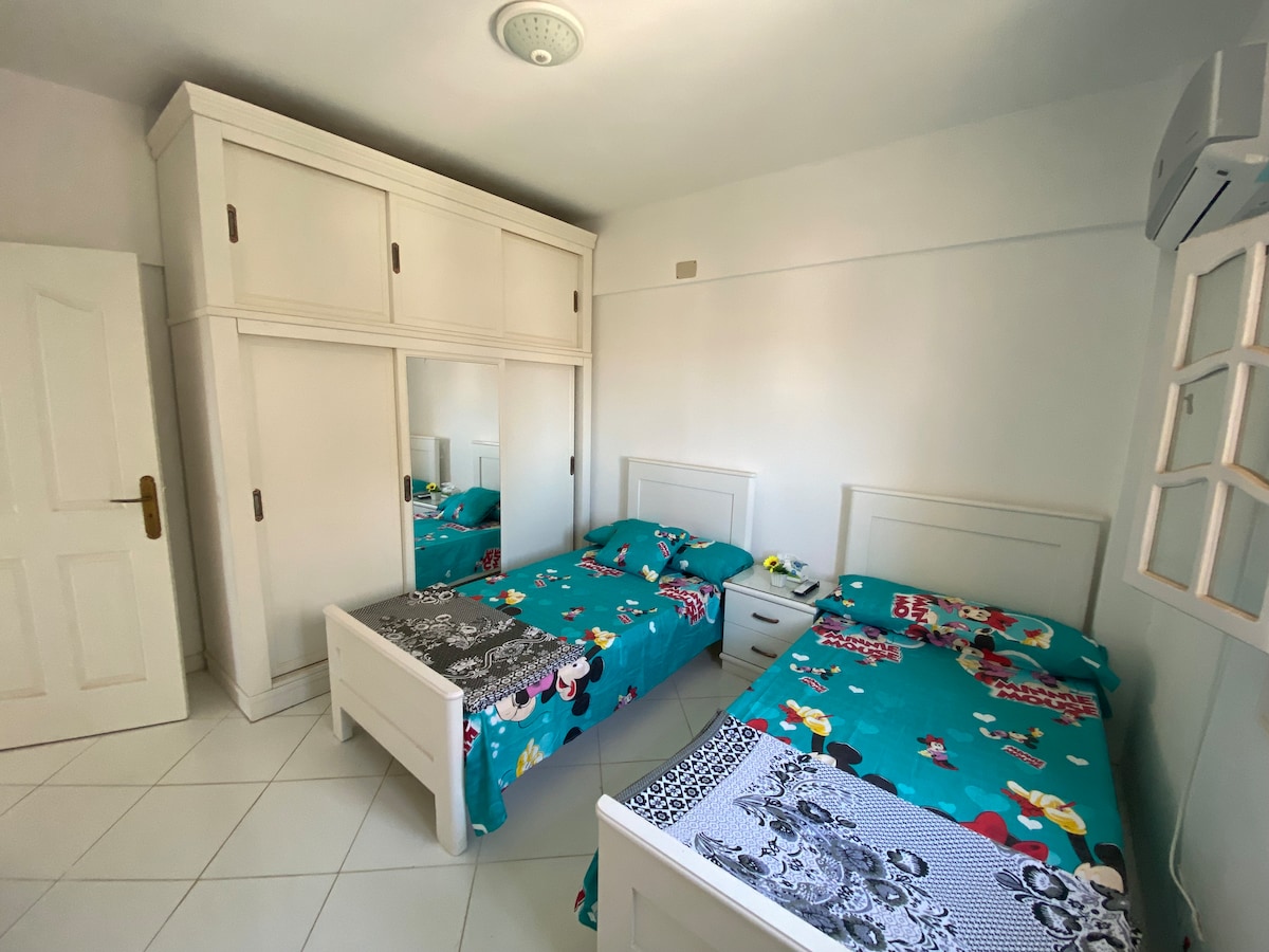 Hermoso y elegante chalet con jardín en Diamond Beach. Chalet: - 3 habitaciones con 2 camas grandes cada una. - Sala de estar con sofá cama - Cocina americana - 2 baños - Herramientas de jardín y barbacoa - Wifi y TV inteligente ** Las 3 habitaciones tienen aire acondicionado, la sala de estar con ventiladores celing ** Diamond Beach Village: - 5 piscinas - Playa con cafetería. - Área para niños - Billiardo - Ping-pong - Estación de juegos - buggy de playa y bicicletas. - KFC - Pizzahut - Supermercado BIM - Cajero automático NBE A 15 minutos de Marina A 10 minutos de Zahran A 25 minutos de Stella Walk