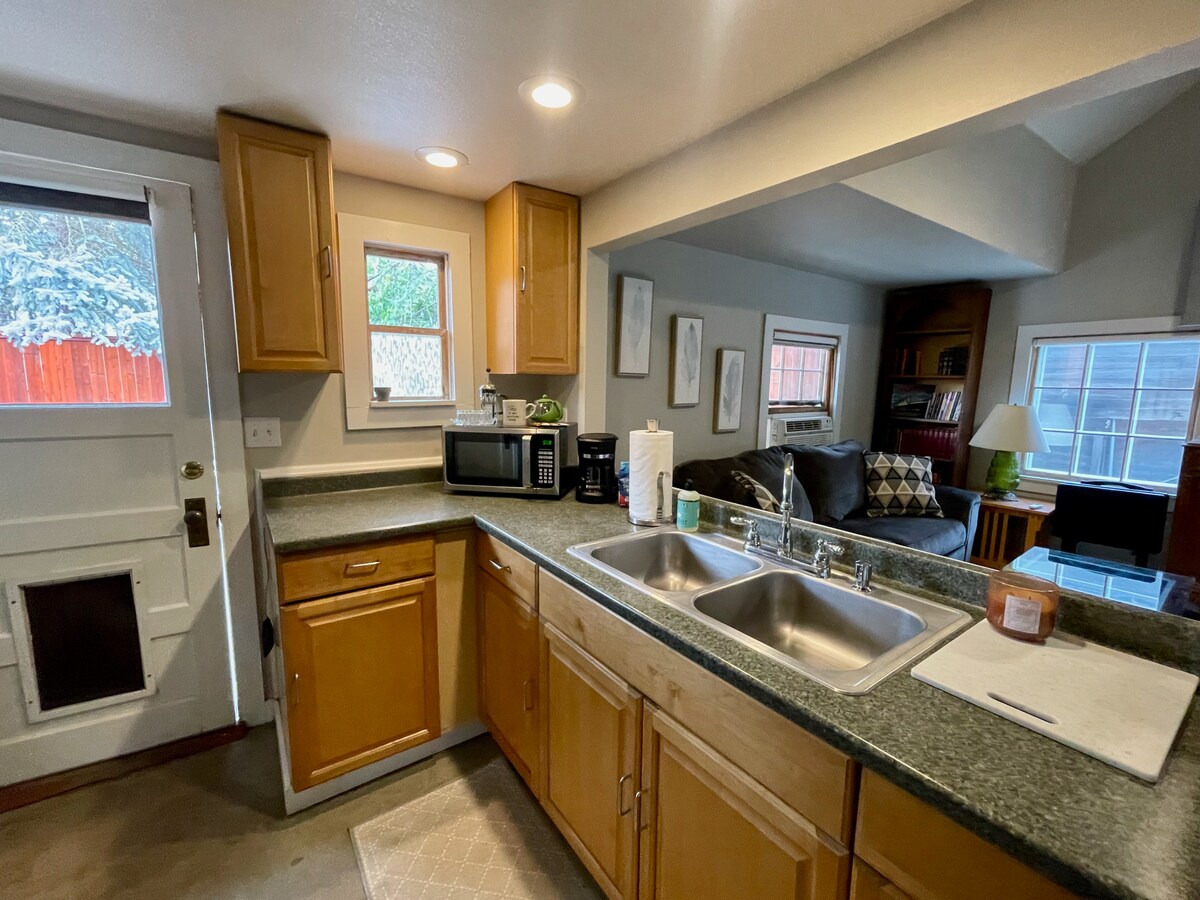 Treehouse Sanctuary es un espacio para huéspedes construido a mano cerca del centro de Boise. Este estudio de 480 pies cuadrados lleno de luz en la planta superior cuenta con arte de Idaho, pisos de madera climatizados, fregadero de granja, estufa de gas, escritorio antiguo, cama tamaño queen firme pero suave, tocadiscos, altavoces Bluetooth, cómoda silla reclinable, bañera con patas y wifi. ¡No hay TV! Estacionamiento gratuito en la calle. Terraza elevada con vistas al jardín. Jacuzzi. Escaleras de acceso. No se admiten mascotas. El propietario vive en una casa principal separada. ¡Bienvenida LGBTQ! El espacio resuena con una energía pacífica y curativa.