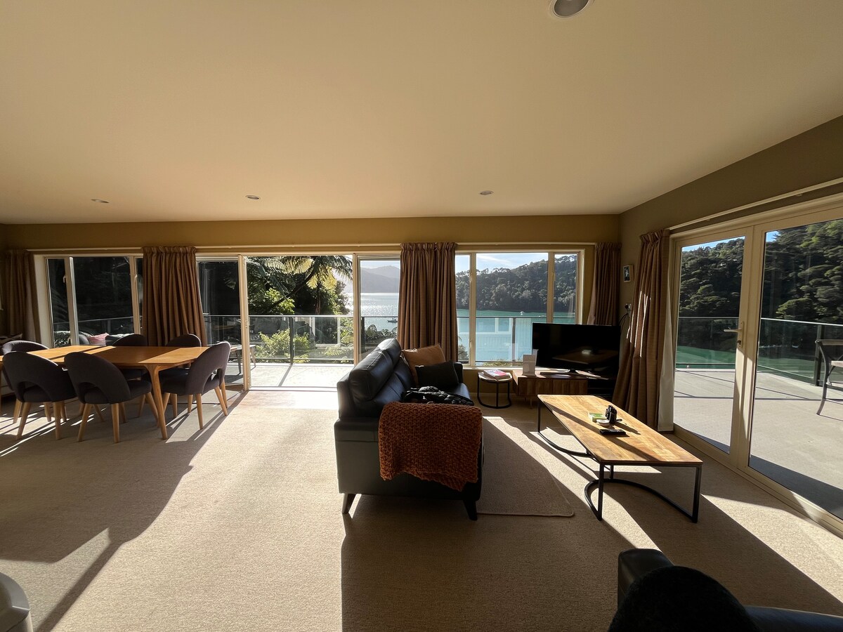 ¡Frente al mar! Nuestra exclusiva suite de invitados semiautónoma de la planta baja está frente a la playa en el pintoresco Marlborough Sounds. A solo 10 minutos en coche de Picton, donde el tren, el autobús o el ferry te conectan con la puerta de entrada de la Isla Sur o la Isla Norte. Sumérgete en la piscina del spa, relájate en una terraza con una copa de vino, utiliza los kayaks o la tabla de paddle surf o echa una caña de pescar a pocos metros de tu suite. Ubicación única justo a orillas del agua en el precioso Marlborough Sounds.