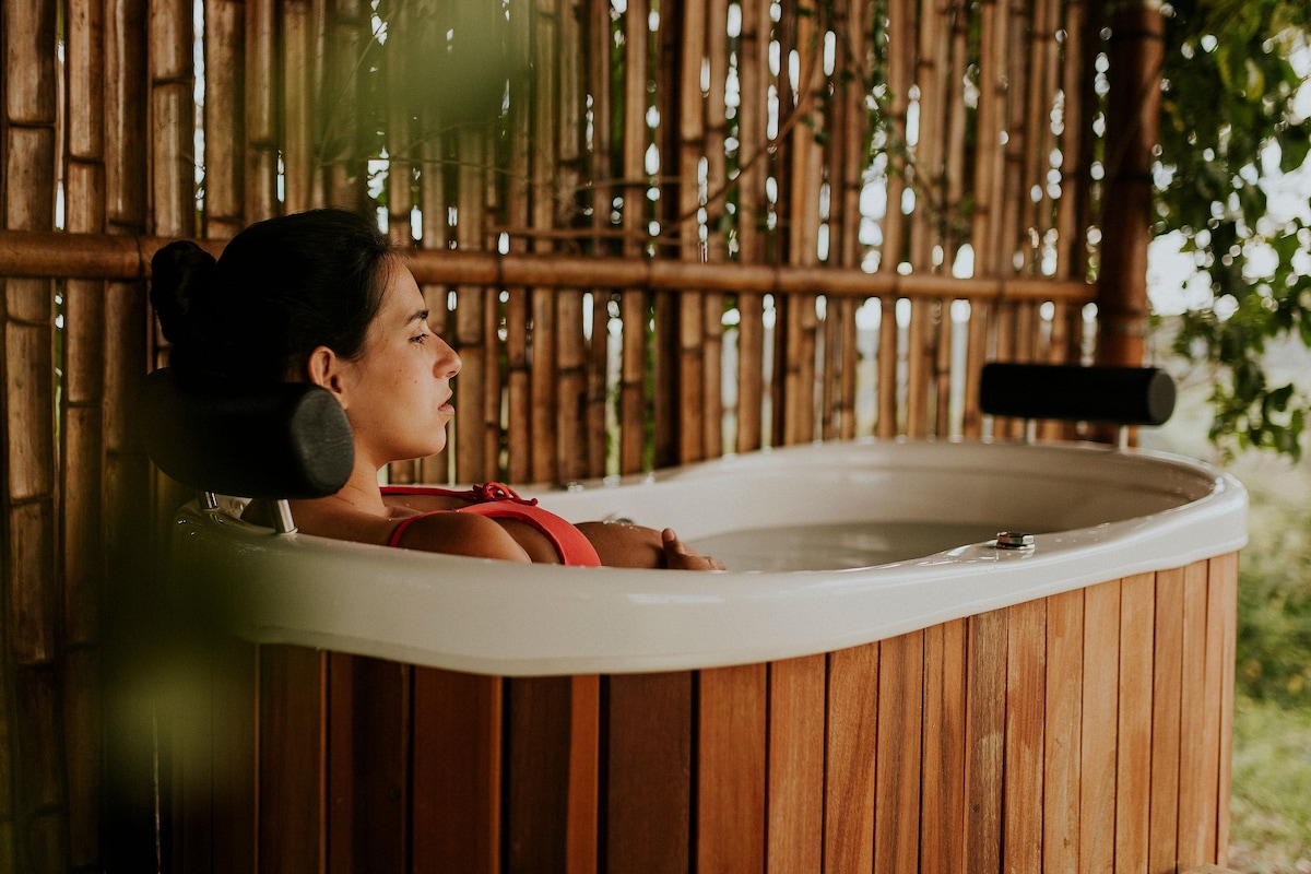 Bungalow forestal sostenible con vistas al mar cerca de Morro de São Paulo Escápate a este refugio único y tranquilo ubicado en la selva tropical de Gamboa. Se accede a este elegante y distintivo bungalow a través de un camino elevado de madera que serpentea a través del bosque. Disfruta del desayuno servido en tu bungalow. Sumérgete en la naturaleza que te rodea. Perfecto para aquellos que buscan relajación y un toque de aventura.