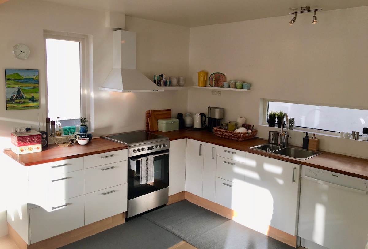 Hyggelig og veludstyrt kælder lejlighed med egen indgang, terasse og god udsigt. INGEN RENGØRINGS GEBYR :) Der er gratis the og espresso kaffe fra Rombouts & Malongo. Gratis brug af kombi vaske/tørretumbler i lejligheden. Vi vil meget gerne hjælpe Jer, så I får en god oplevelse her på Færøerne. Vi respektere ikke fester og rygning inde. Ellers vil vi at du skal føle dig hjemme :)