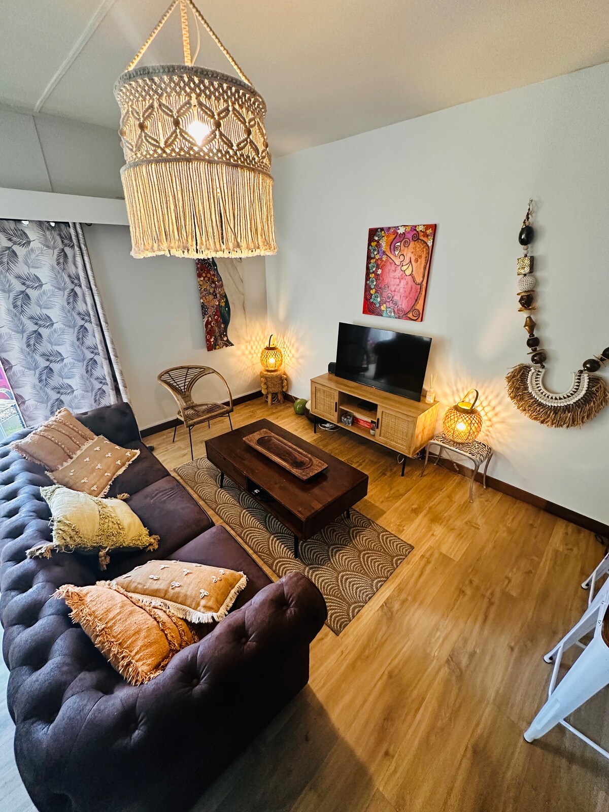 Cet hébergement spacieux est au calme de la végétation à Robinson. Parfait pour un séjour tout confort dans le style océanien. Une cuisine et un salon en LOFT. Une chambre a part avec un bureau . Une salle d'eau . Une machine a laver et une cuisine toute équipé avec un grand frigo. la télévision est sur Netflix avec une connexion WIFI Fibre . Une petite terrasse extérieur au calme..