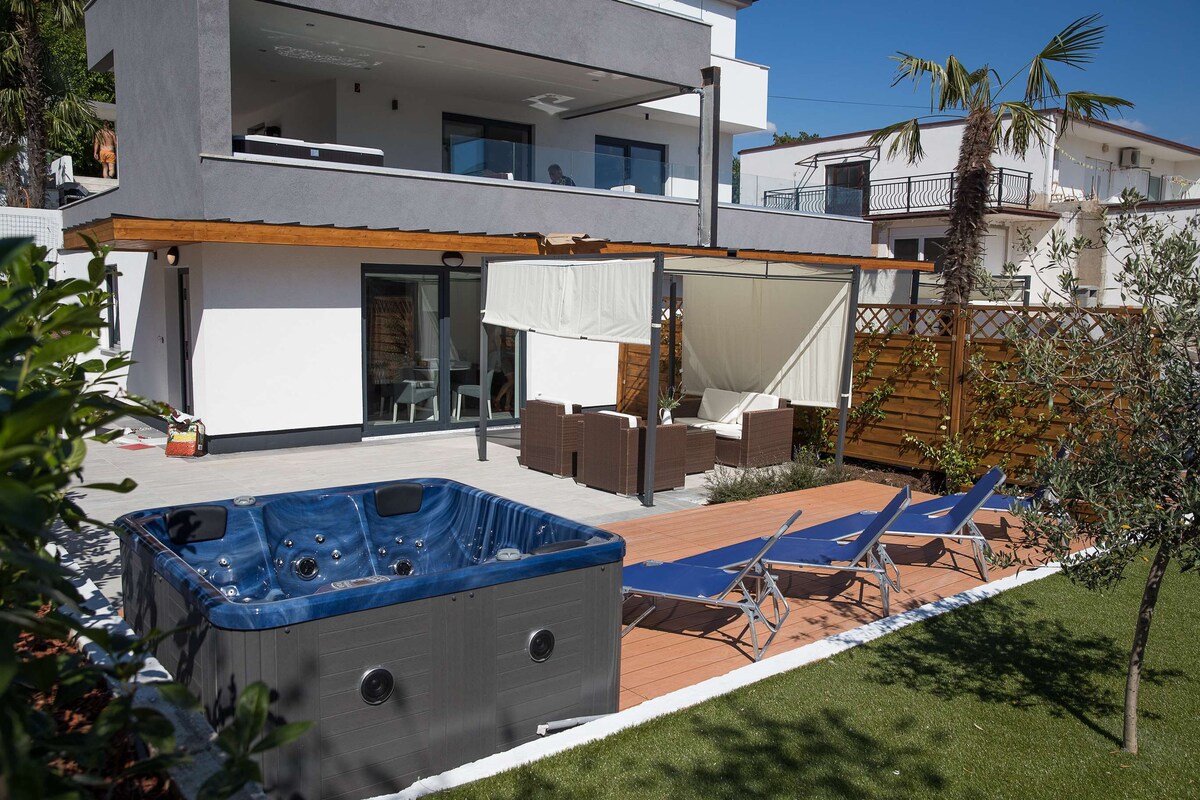 Ya sean vacaciones activas o románticas para dos o en familia con un máximo de tres hijos, en nuestro alojamiento no te falta nada. Esperasuna vista impresionante al mar, una piscina espaciosa, una bañera de hidromasaje con vistas, una sauna privada con vistas, una enorme parrilla de carbón con cocina al aire libre, cocina totalmente equipada con isla y refrigerador uno al lado del otro, una terraza privada, un espacio de estacionamiento personal, jardín comunitario con área de fitness y mucho más...