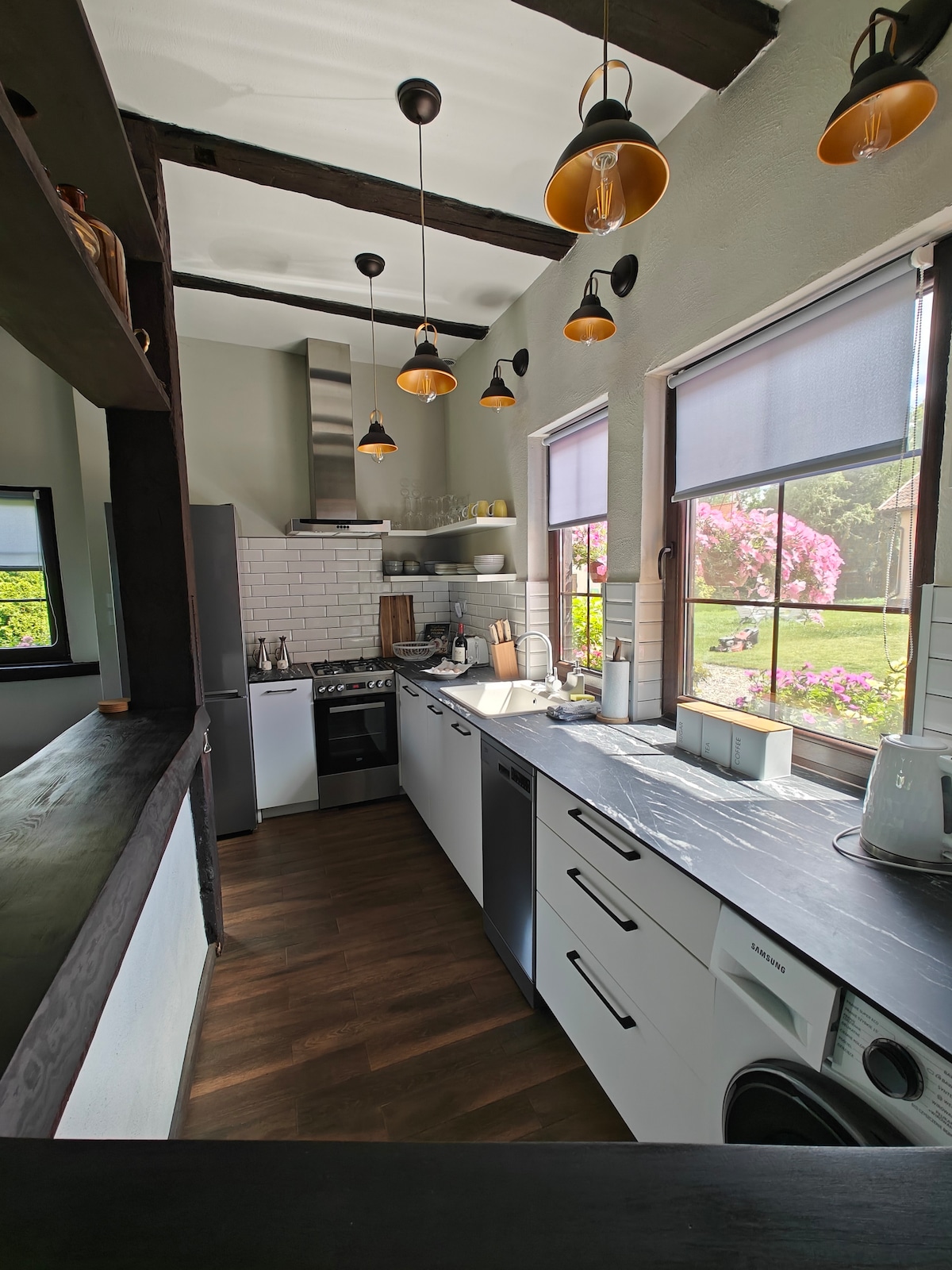 Nuestra casa de madera ha sido diseñada de forma moderna y funcional. Hemos intentado integrarnos perfectamente en el entorno y no perturbar la naturaleza que nos rodea por todos lados. Nuestro pequeño pueblo no se ha rendido al tiempo, todo funciona aquí como antes. No hay tiendas ni restaurantes, no hay turistas, solo silencio y naturaleza. El pueblo está rodeado de prados y el bosque de Puszcza Piska, a 10 km de las ciudades más cercanas. Las grullas y las innumerables aves acuáticas te invitan a un espectáculo diario. Aquí encontrarás la paz.