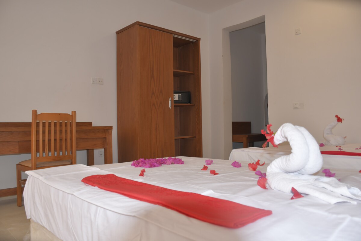 La habitación con cama doble frente a la playa n .º 12 se encuentra en el edificio frente a la playa del Blue Tides Hotel. Se encuentra en el primer piso del edificio. Tiene una impresionante vista del océano Índico Azul con un bonito balcón grande. Es una habitación preciosa con dos camas dobles.