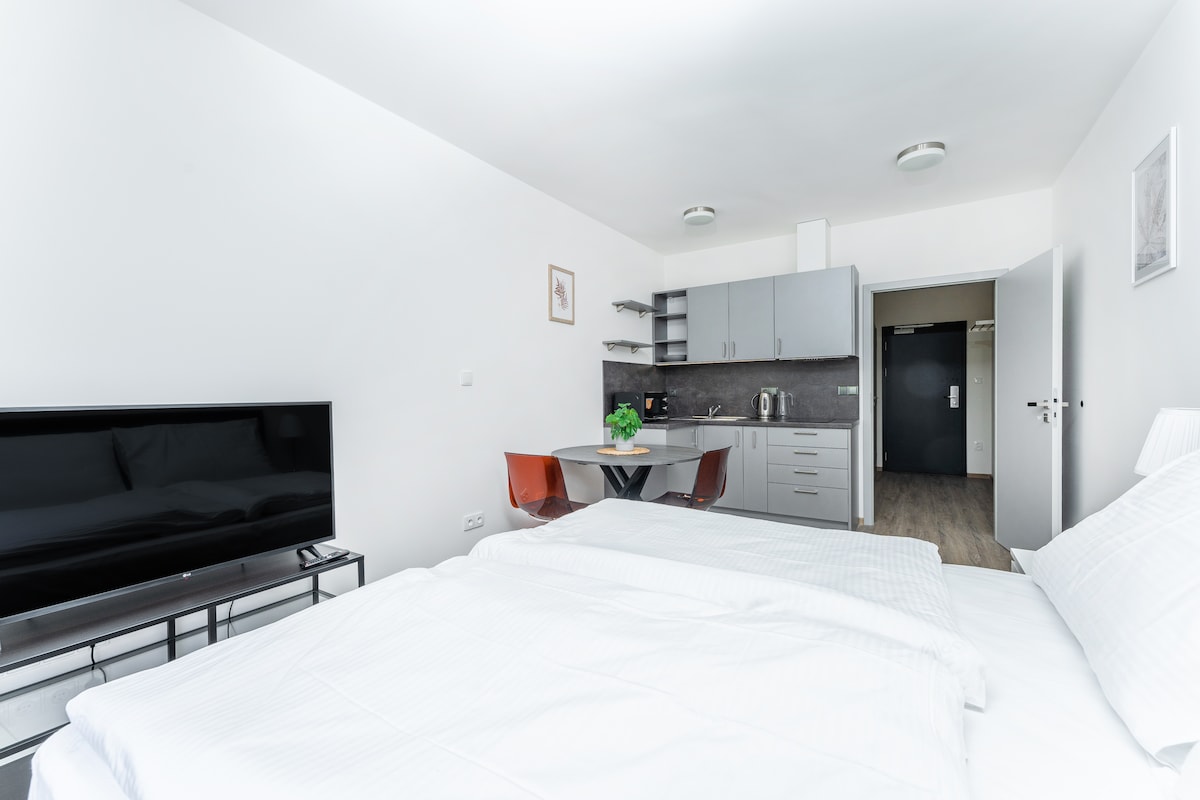 Calle: Čechova 114: Apartamento n.º 58 «Londres» de 39 m2 en el último piso de un edificio nuevo con balcón. Planta VIP cerrada con ascensor de chip, 100 % seguridad, servicio y comodidad. Aire acondicionado, equipamiento completo, incluidos platos y toallas. A 300 metros del centro, la columnata de Poděbrady, a 2 minutos de la estación de tren y autobuses, a 55 minutos del centro de Praga. ¡Internet de 350 Mbit de subida y bajada sin límites! Cobertura wifi completa. Televisor 4K de 55 pulgadas. Lavadora y secadora, lavavajillas, nevera/congelador, microondas.