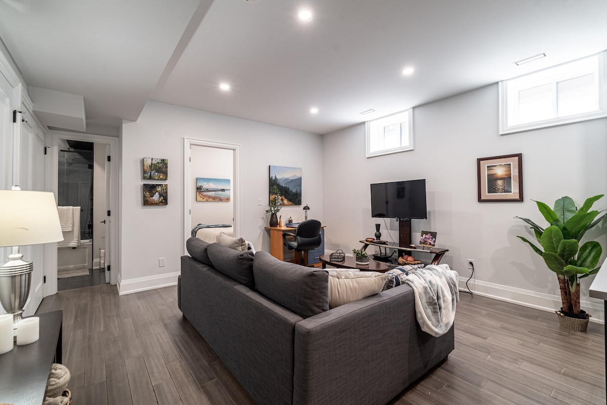 Suite de invitados luminosa, limpia y espaciosa en la planta baja ubicada en el moderno barrio de St. Nuestra suite es la más adecuada para adultos que quieran explorar la ciudad y disfrutar de los sitios, viajeros de negocios que quieran privacidad y un espacio de trabajo cómodo o familias que visitan a sus familiares. Ofrecemos los servicios que necesitas y algunos que no esperarías. El dormitorio de inspiración Mid-mod con cama tamaño queen es un lugar ideal para descansar la cabeza después de visitar uno de nuestros muchos restaurantes locales de moda.