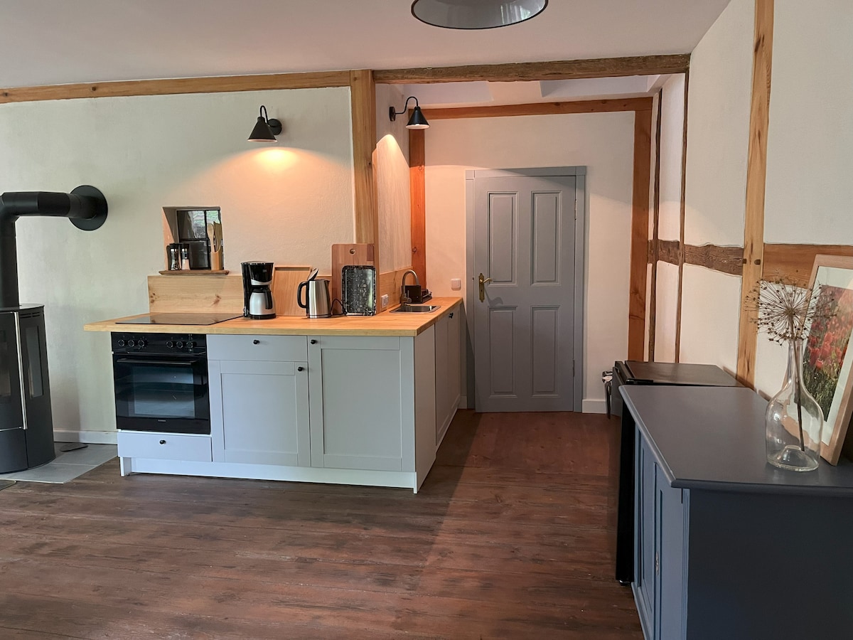 Diseñada con cariño, la mitad de una casa con su propia entrada y área de jardín, ubicada en una zona tranquila y rodeada de naturaleza. En unos 70 m², te esperan dos dormitorios con camas dobles, un baño con bañera y ducha y una acogedora sala de estar con comedor. La moderna cocina está totalmente equipada con horno, lavavajillas y nevera, ideal para parejas, familias o habitantes de la ciudad que buscan paz y tranquilidad.