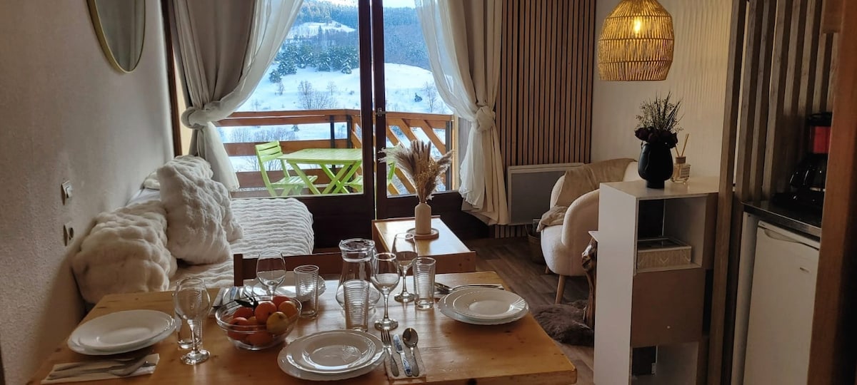 En una acogedora decoración chalet de 3 estrellas con todas las comodidades, totalmente equipado: lavavajillas, lavadora, horno, TV. 2 dormitorios y 1 cama en el altillo. ideal 4 personas máximo 5. Cuarto de baño. Cama / silla / bañera para bebés. Salón con ventanal, estufa de leña y/o radiadores. Terraza con vistas despejadas, muebles de jardín, barbacoa. Cobertizo de jardín cerrado para esquís, bicicleta, cochecito . Aparcamiento privado. Cerca de pistas y servicios: tienda de comestibles, cine y piscina municipal. Transporte gratuito a las pistas