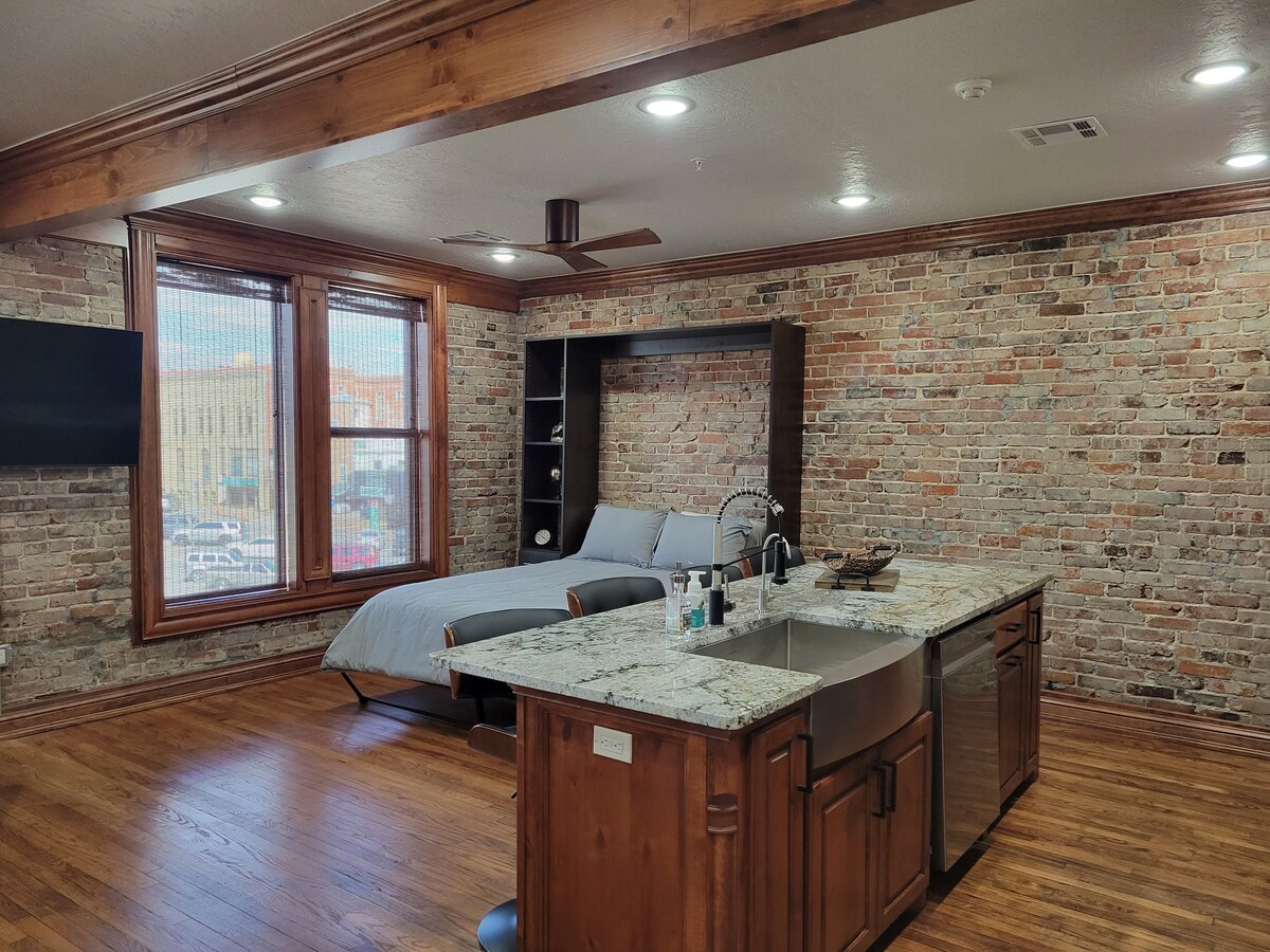 Stay in the center of the action in this one-of-a-kind studio apartment in the heart of historic downtown Clinton, Oklahoma. It is located one block south of Route 66 “Mother Road” traveled by many. Finishing touches range from old historic to new age/modern. Rather than staying in a hotel, we welcome you to come and enjoy our newly remodeled Frisco Studio Apartment loft view of downtown Clinton and its Main Street amenities.