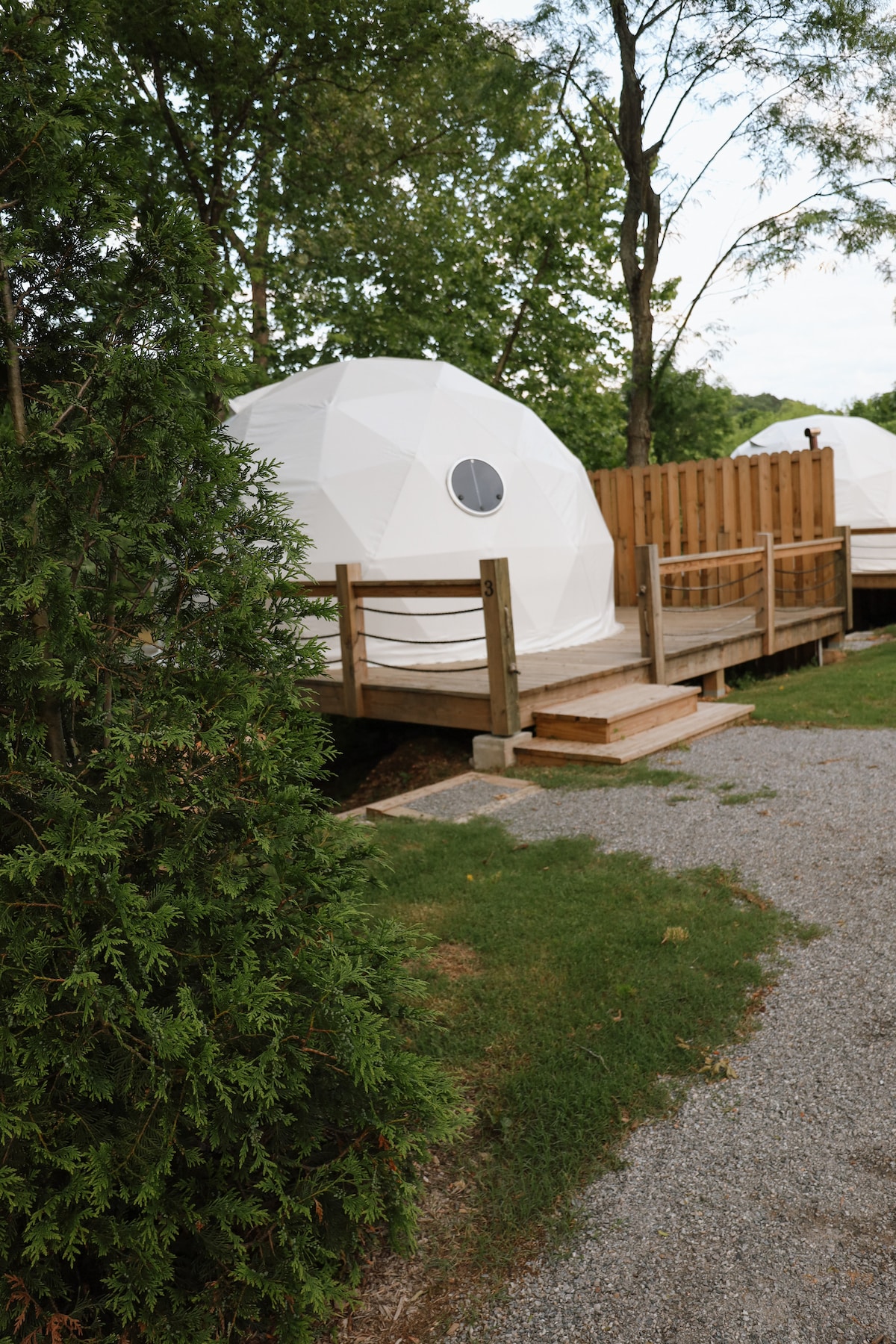Nuestras tiendas de campaña de cúpula se han convertido en lujosas suites para huéspedes. Nuestra propiedad se divide en dos áreas distintas: - Sitios con vista al arroyo: justo a lo largo de Flint Creek con vistas serenas al agua y una sensación de inmersión en la naturaleza. - Commons View Sites: con vistas a nuestra zona común ajardinada, céntrica y con fácil acceso a los servicios. Esta unidad es parte de nuestros sitios Creek View