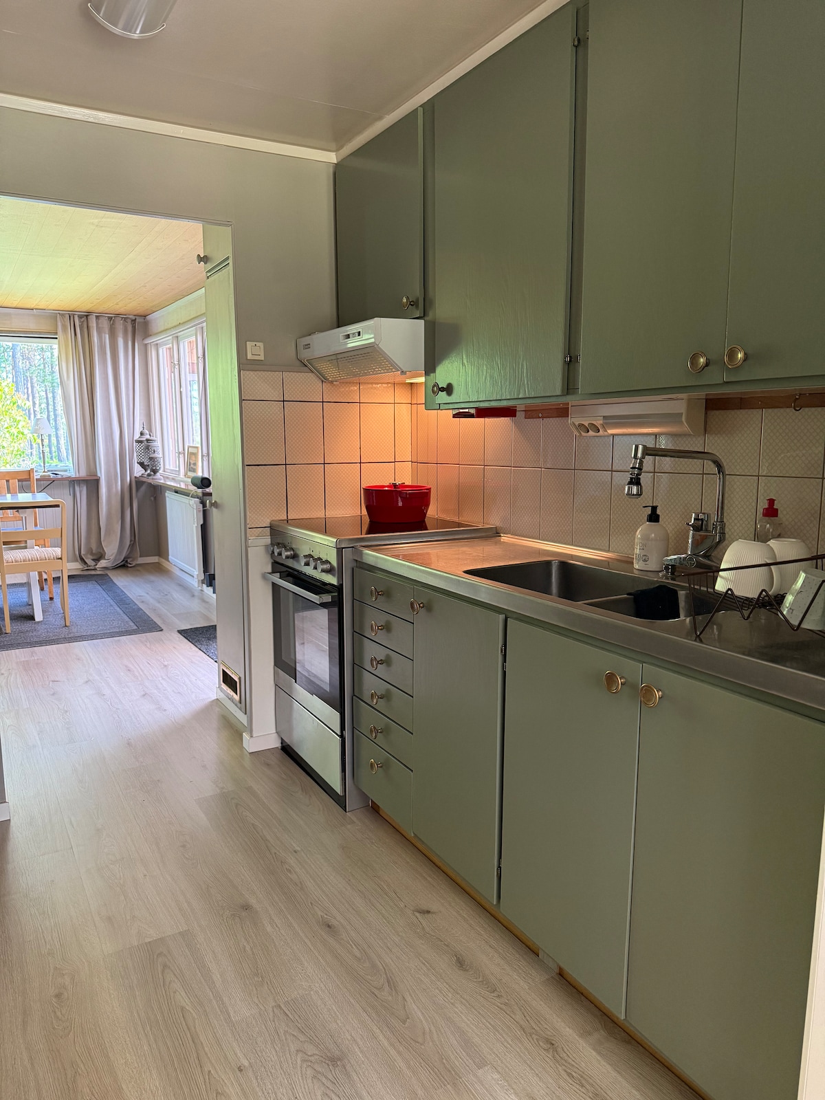 Mysig stuga på 40 kvadrat, sovrum 1 med 1,40 säng, sovrum 2 med våningssäng, toalett med dusch och tvättmaskin, allrum med soffa matbord och tv, kök/pentry med kyl, frys och bänkspis med två plattor och ugn. Det finns en gäststuga på tomten med våningssäng, perfekt till tonåringar. Totalt 5 sängplatser med 3 personer fungerar det fint då huset är litet, wifi och tv finns. Påslakan och handdukar ingår. Grillmöjligheter och två uteplatser. Två cyklar finns att låna, säg till innan.