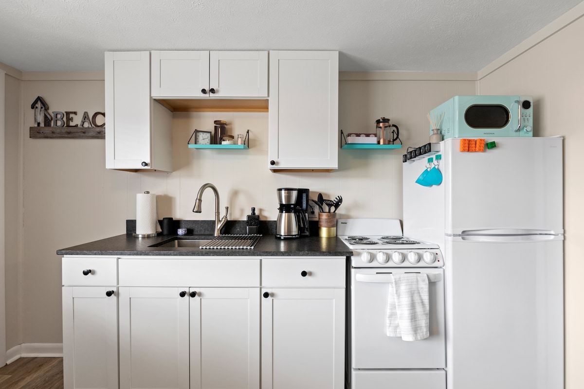 Esta hermosa cabaña ahora cuenta con una nueva cama tamaño queen, un futón doble en la sala de estar y tiene capacidad para 4 personas. La casa incluye una cocina totalmente equipada con microondas, nevera, cafetera, tostadora y zona de comedor. TV inteligente, wifi, aire acondicionado y calefacción central. También cuenta con un baño completo privado con combinación de bañera y ducha en este alojamiento único y relajante. ¡Disfruta de la privacidad de tu propia casa de campo junto al mar cerca de la playa! Barbacoas y mesas de picnic con sombrillas salpican el patio.