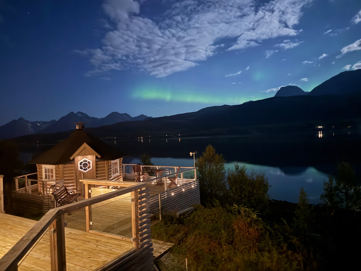 Aurora de la cabaña Lyngen con sauna y vistas al fiordo