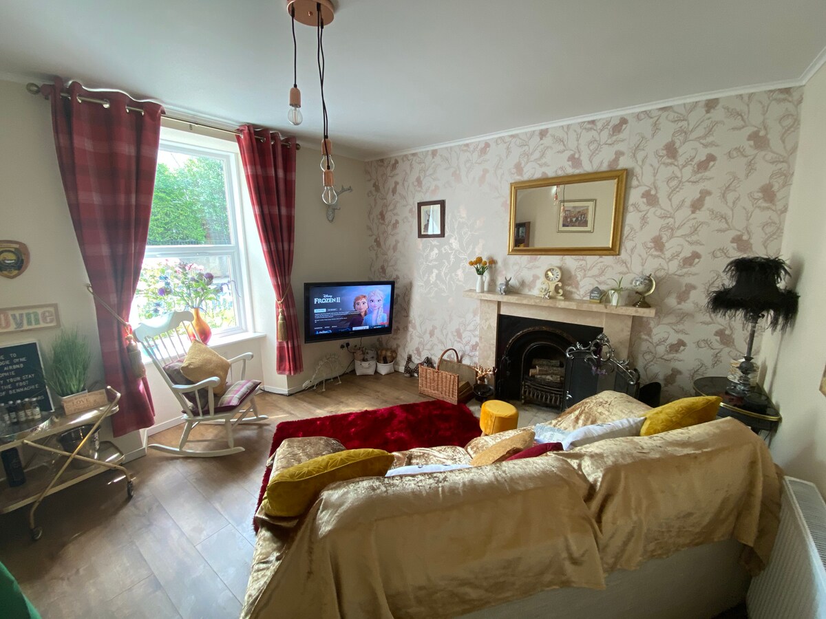 Una casa de campo tranquila con terraza en Huntly, fuera de las calles principales, pero a poca distancia a pie de la estación de tren y del centro de la ciudad. La acogedora sala de estar está equipada con una eficiente estufa de leña y encontrarás una cesta de leña a tu llegada. La cocina está situada en la parte trasera del edificio con acceso a un pequeño jardín cerrado perfecto para un desayuno lento al sol o una bebida nocturna en el césped. El baño es accesible a través de una escalera arriba. ¡Estamos deseando recibirte!