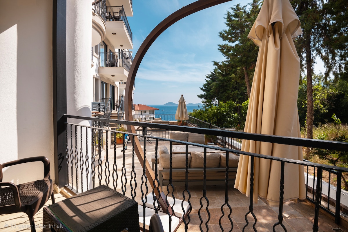 We would like to see you as our guests in our suite, which is in the most central location of Fethiye, with sea view, in the area of restaurants and cafes, close to markets, in short, everything is one step away, with two bathrooms and an elevator. There are beaches, ancient cities, and wonderful natural beauties waiting for you to discover in Fethiye. While experiencing these during the day, you can come home in the evening and relax on the balcony watching the sunset reflected in the sea.