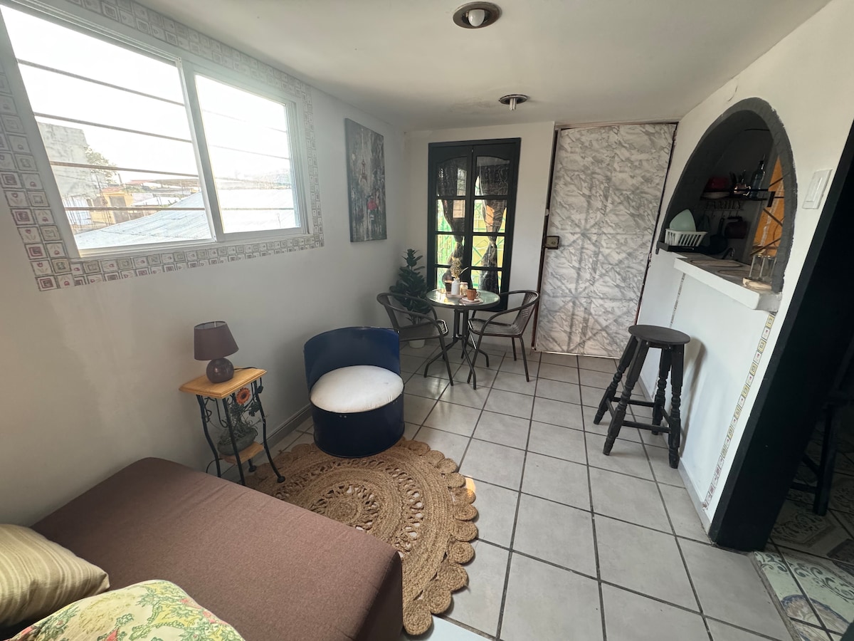 Hospédate en el corazón de Acayucan en un mini departamento práctico y acogedor, ideal para viajes de trabajo o descanso. Disfruta de una cama matrimonial cómoda, TV, clima y ventilador para tu confort. La cocina está equipada con minifrigo, cafetera, mesa y utensilios básicos, además de un sillón con mesa auxiliar, clóset y baño privado con espejo. Su ubicación céntrica te mantiene cerca de comercios, restaurantes y transporte, lo que hace tu estancia aún más práctica y agradable.