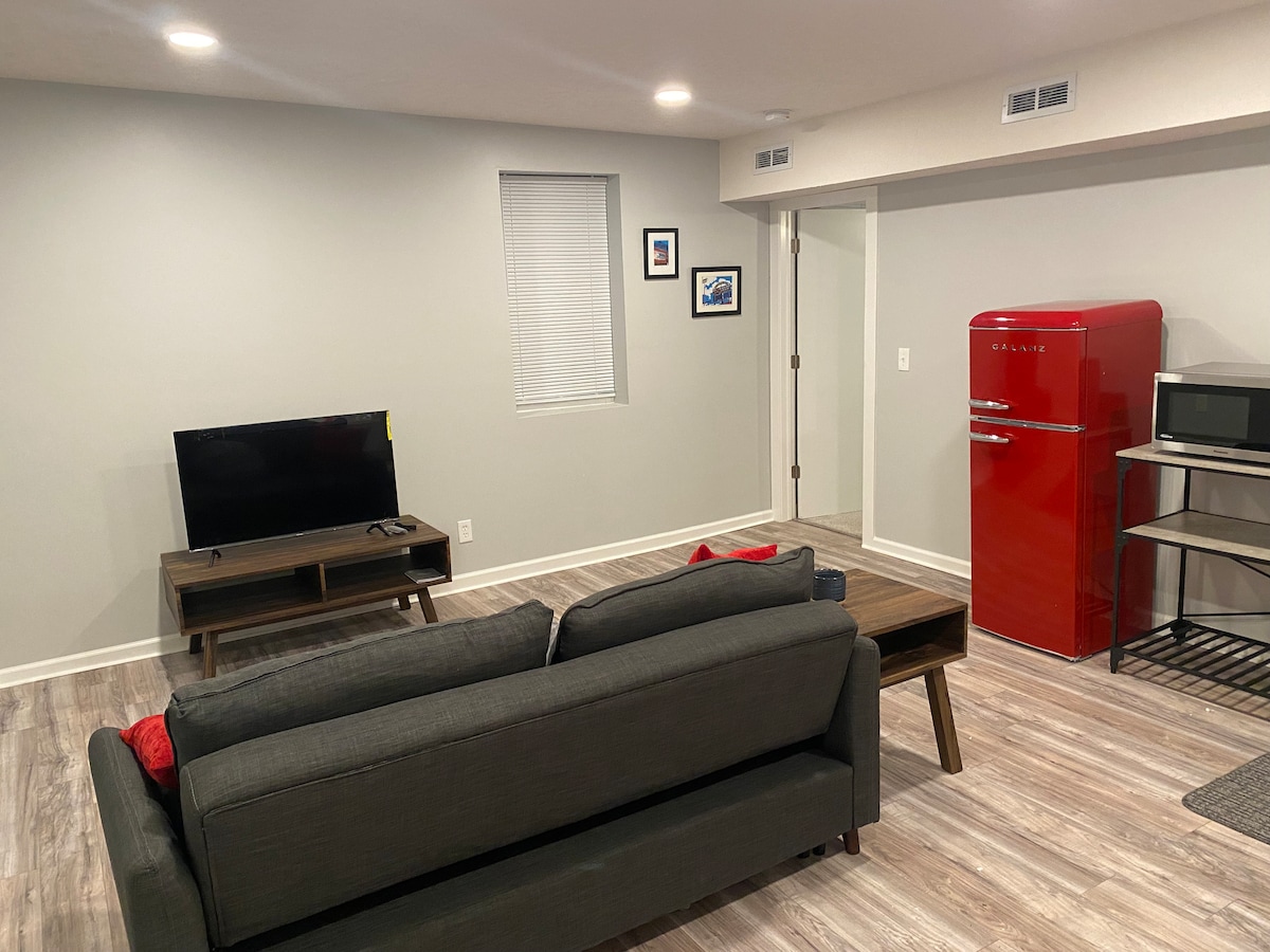 ✨ Lujoso sótano privado 2BR/2BA ✨ Entrada 🔑 privada | 📶 1-Gig WiFi Proyector de🛋 80" con Netflix | Arcade retro + juegos | TV Roku de 43" Cocina 🍽 completa: cocina a gas, nevera con dispensador de agua y hielo, 4 opciones de café para la preparación perfecta. 🛏 2 dormitorios, 2 baños | Sala de estar con calefacción por suelo radiante | Capacidad para 7 personas cómodamente, apto para bebés 🛁 Jacuzzi y sauna con altavoces (en línea) 🔥 Fogata y parrilla de carbón listas para cocinar al aire libre 🚪 Nueva puerta de privacidad en la parte inferior de la escalera