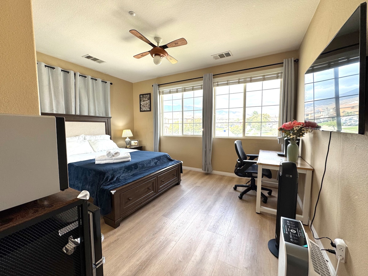 Suite privada con una vista impresionante desde el balcón, TV Roku, baño privado y una cocina con placa de cocción, microondas, horno de freidora de aire Cuisinart, Keurig, tostadora y nevera de tamaño completo. Ubicado al norte de la 210 con acceso a todas las principales autopistas, incluida la autopista 15. El sistema de aire independiente solo da servicio a la suite. Estamos a 3 minutos en coche del centro comercial Ralph's, que también cuenta con tiendas como Starbucks, Wells Fargo, UPS y Enterprise. A 15 minutos en coche del aeropuerto de Ontario.