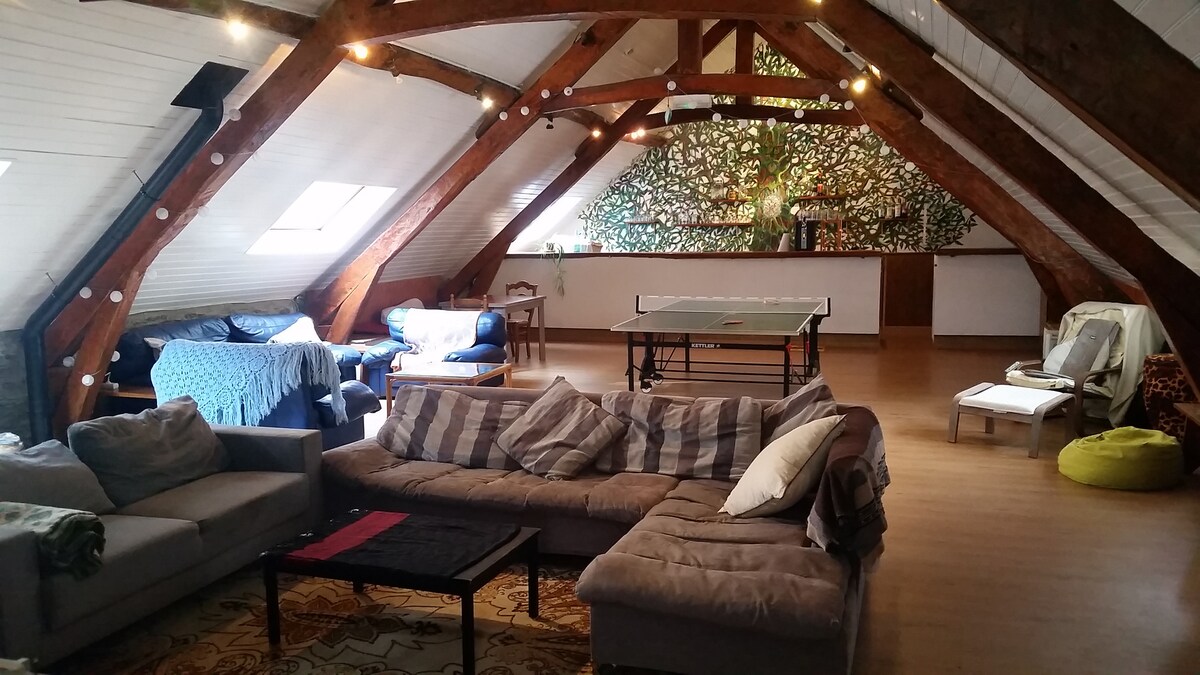 La casa rural "Solfé backpacker" es ideal para grupos de todo tipo. Modulable y muy espacioso (350 m²), adecuado para unas vacaciones con amigos, en familia o incluso una estancia profesional. Al lado de las estaciones de esquí y baños termales. - 2 dormitorios de 4 (posibilidad de poner una cama de matrimonio en lugar de una cama individual) - 1 habitación doble con baño privado. - 1 bloque sanitario (muchas duchas e inodoros) - 1 gran cocina común con comedor - 1 gran sala de estar - 1 gran terraza