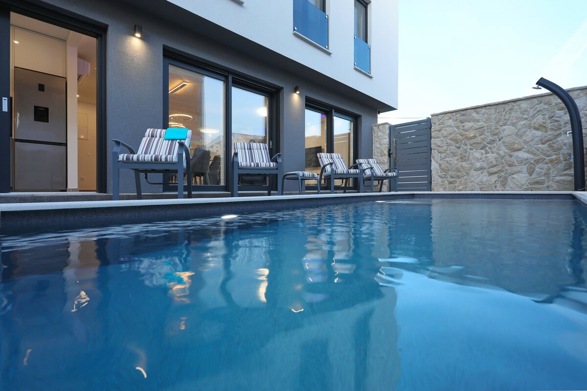 This brand new villa is located in a quiet location only 70 meters from the sandy beach. Restaurants, bars and supermarket are reachable on foot. The house consists of three bedrooms, a living room with dining room, a fully equipped kitchen, a bathroom, a toilet and a yard with swimming pool. All rooms are air-conditioned and have a TV. Our guests have a free parking, WiFi and barbecue. All contents are private. The city of Nin is a 10 minutes drive away.