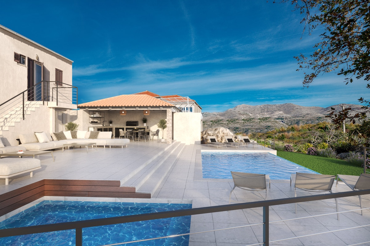 Descubre una joya en la hermosa costa de la riviera de Dubrovnik en Villa Maris, a solo 15 minutos en coche del antiguo casco antiguo de Dubrovnik. Situado en la colina sobre el mar Adriático y la hermosa bahía de Mlini. Relájate con la familia y los amigos en este nuevo y moderno alojamiento tranquilo. Retiro de lujo privado y aislado en tu propio centro vacacional privado con jacuzzi, piscina, cocina al aire libre y vistas increíbles al profundo mar azul Adriático y las colinas circundantes. También somos propietarios de Villa Paulina - Privacidad exclusiva