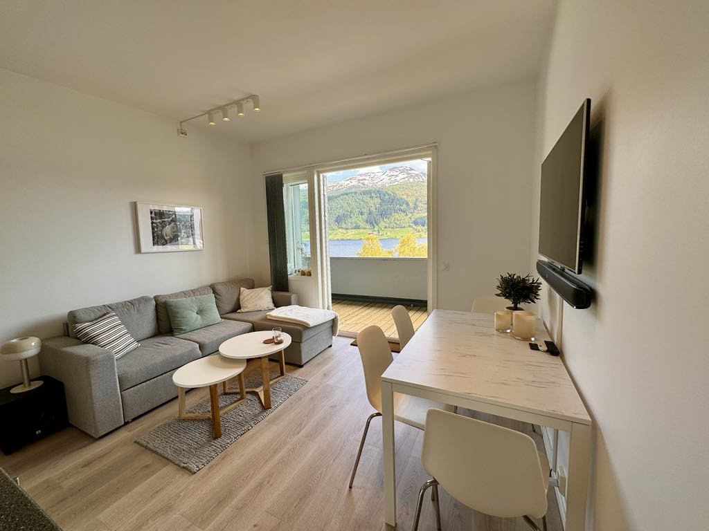 Modern and cozy apartment on the first floor. Living room and kitchen with cooking facilities and fridge. Tiled bathroom with washer and dryer. Spacious bedroom with large double bed (200x180) Good parking spaces right by the house. Access to garden with outdoor furniture. Great view towards the center of Vinje and Lønahorget. Hiking trails and activity opportunities right outside the doorstep. Walking distance to grocery and gas station.