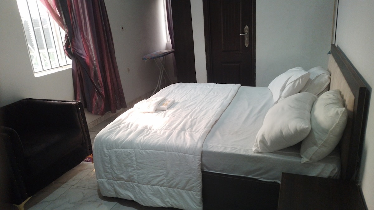 An exclusive fully furnished mini Flat (One Bedroom Flat) Serviced Apartment with all the amenities to make your stay most enjoyable, sited in a centrally located position that is secured and peaceful, exclusive in lots of ways, it's located inside the NNPC Estate which is known for guaranteed uninterrupted power supply and security within the heart of Warri town. Located at Number 5 Anambra Close, Off Refinery Drive, NNPC Complex Road, Off Airport Road, Edjeba, Warri-Ekpan, Delta State, Nigeria