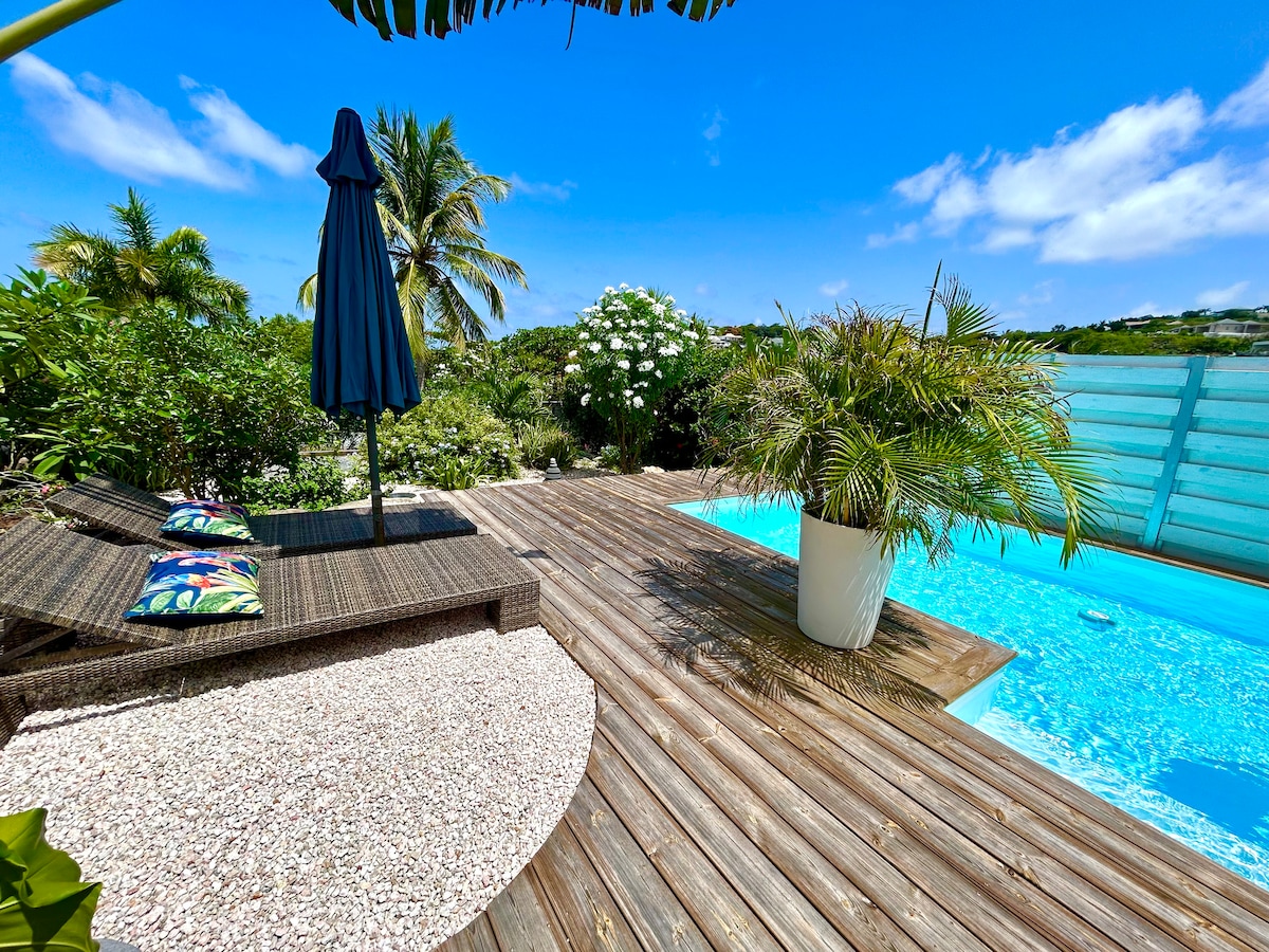 Amplia villa de 200 m² con vistas panorámicas a la playa de Orient Bay. Se caracteriza por una piscina muy grande, junto a una gran terraza parcialmente sombreada, equipada con una cómoda sala de estar al aire libre y una mesa ideal para disfrutar de sus aperitivos y comidas mientras admira el mar. Orientada al sur, se beneficia de un hermoso sol desde el amanecer hasta el atardecer, así como de la suavidad de los vientos alisios.