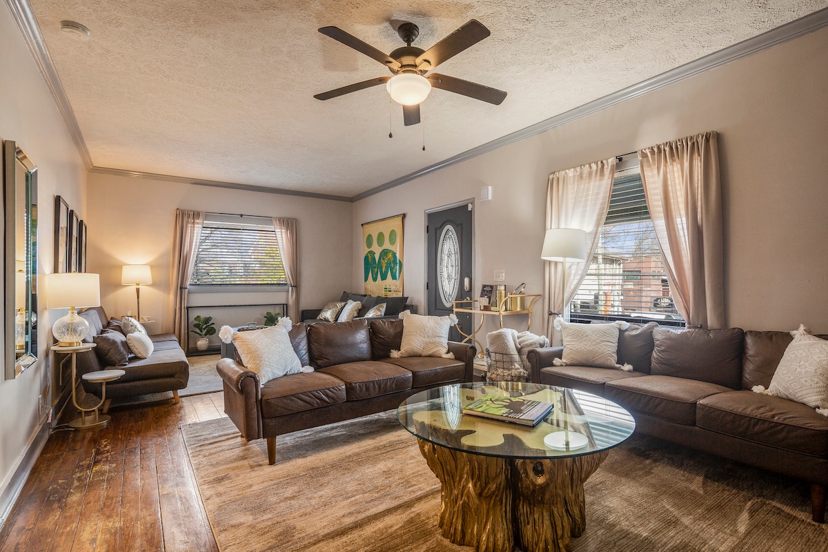 Relájate en un elegante sofá modular de mediados de siglo en medio del estilo retro, las obras de arte eclécticas y los techos abovedados dentro de esta cautivadora casa de estilo loft. Prepara la cena en una cocina con superficies de esteatita y cena al aire libre en una mesa de la vieja escuela en el patio. Completamente renovado con ropa de cama de hotel de lujo nueva, manteniendo las maderas originales y el encanto de esta casa antigua. Dos dormitorios en el primer piso y dos en el segundo, fácil acceso para todas las edades. A 10 minutos del centro de la ciudad y del Centro de Exposiciones.