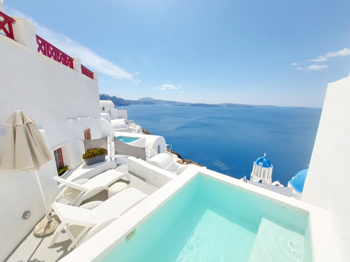 Suite con piscina de inmersión al aire libre y vistas a las cúpulas azules