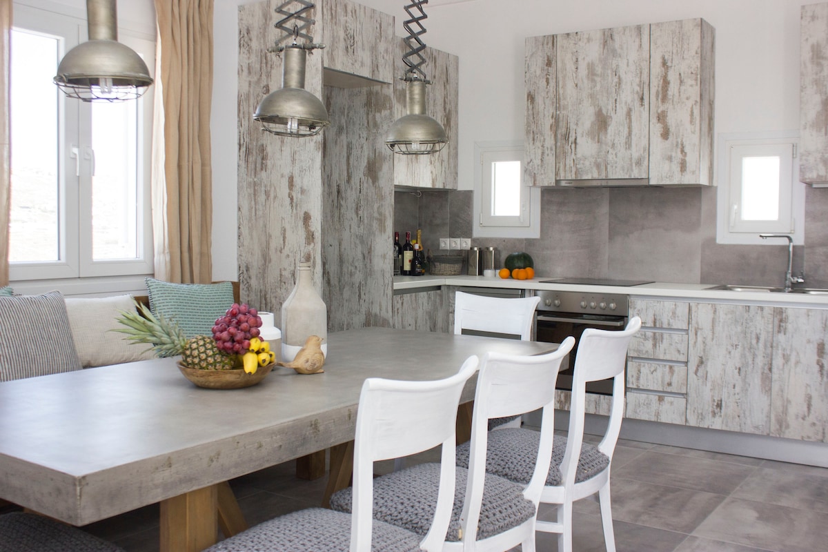 New, fresh and luxury apartment in a peaceful neighborhood only 900 meters from the famous Ornos beach, 1 km from Korfos beach( the best beach on the island for kitesurfers) and 7 minutes drive from Mykonos Town. The ideal location, the unique ambience and the breathtaking view make Ornos Vibes the best choice for the summer vacations in Mykonos. Perfectly combined with Ornos Vibes for a total of 8 guests capacity.