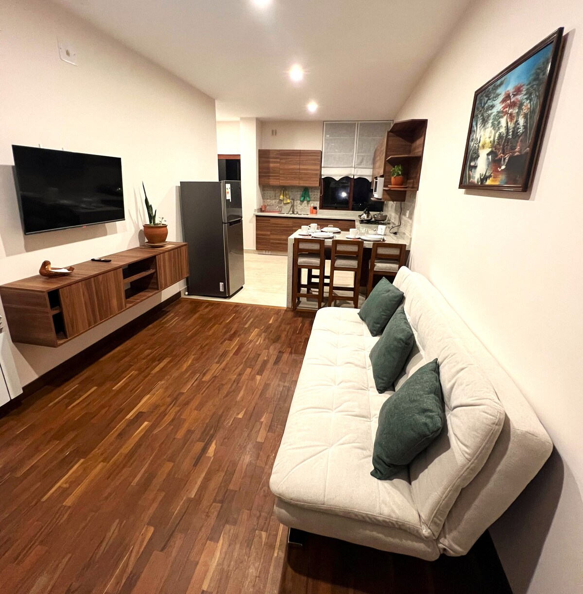 Disfruta de una estadía en este acogedor y colorido departamento a solo dos cuadras de la plaza central. Ubicado en el corazón de la ciudad, cerca de restaurantes, cafeterías, mercados y centros de abastecimiento. Ideal para quienes buscan comodidad, funcionalidad y un ambiente vibrante. Su decoración alegre y luminosa te hará sentir como en casa desde el primer momento.