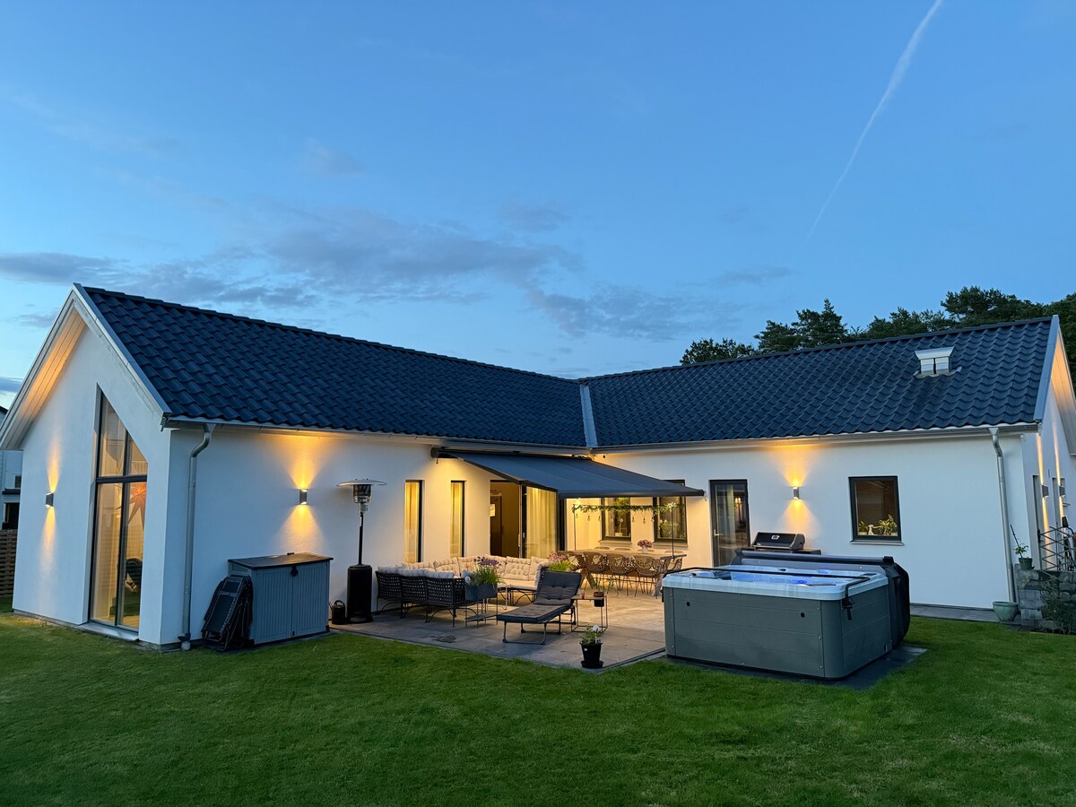 Bienvenido a una villa moderna construida en 2021 en la naturaleza tranquila cerca del bosque y con distancia en bicicleta a un lago de natación con una playa de arena La casa tiene 185 m² con una planta abierta, un techo de paja y grandes ventanales. Las puertas correderas conducen al patio orientado al sur con jacuzzi. Cuatro dormitorios, oficina y gimnasio Lugares para dormir: dos camas dobles (180 cm), una cama de 105 cm y una cama de 90 cm. Dos baños con ducha, uno de los cuales tiene bañera. Fibra con wifi estable, TV inteligente de 98 pulgadas y sistema de sonido Bose en toda la casa. Posibilidad de alquilar un coche y bicicletas