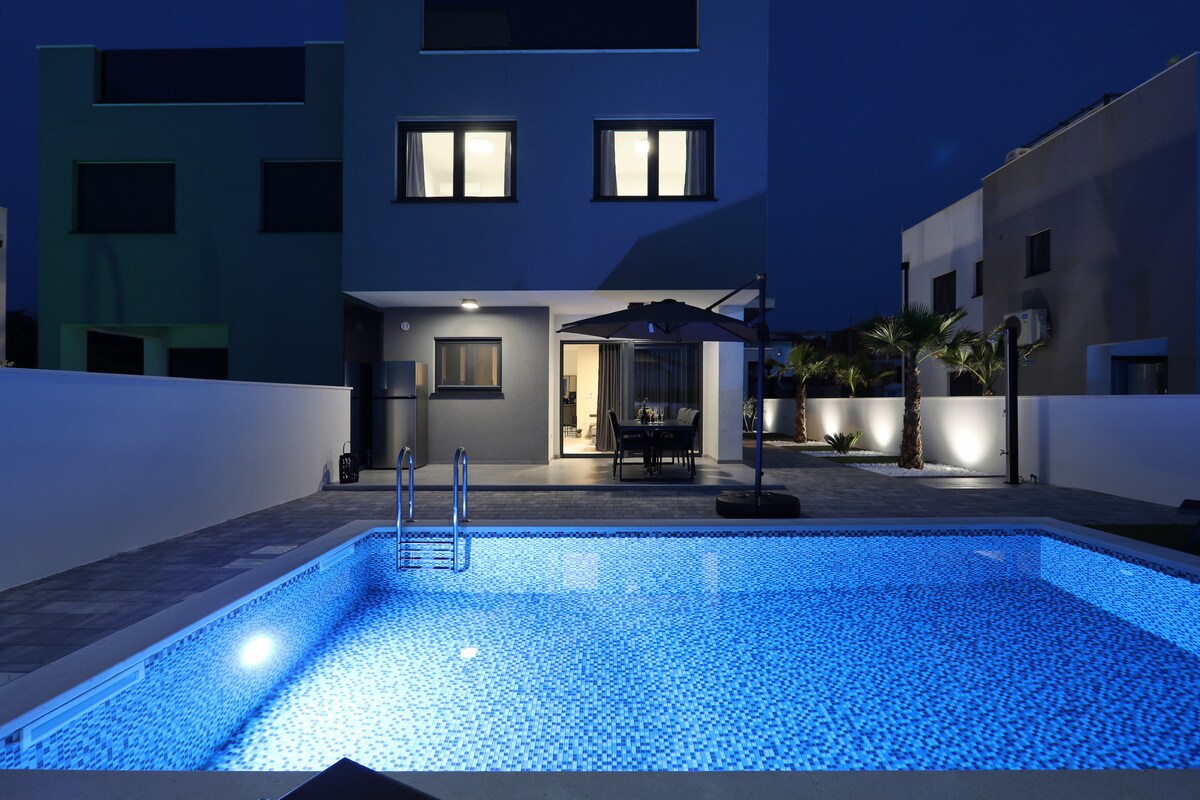 Esta nueva villa se encuentra en el centro de la ciudad y cerca de la playa. La casa consta de tres dormitorios, sala de estar con comedor, cocina totalmente equipada, tres baños, terraza, piscina privada y estacionamiento. Todas las habitaciones tienen aire acondicionado y dos dormitorios tienen su propio baño. Muy cerca se encuentra la histórica ciudad de Nin y una famosa playa de arena. Nuestros huéspedes tienen wifi gratuito y barbacoa.