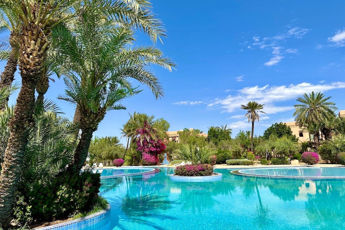 Nuestro bonito apartamento se encuentra en el corazón del famoso palmeral del pueblo de Marrakech. Este último, se encuentra en una residencia tranquila y bellamente arbolada de 40 hectáreas. Hay piscinas y pistas de tenis disponibles. Es el lugar perfecto para reunirse con amigos o familiares para compartir momentos agradables en un entorno relajante. A 10 minutos del centro de la ciudad de Marrakech. 20 min hasta el aeropuerto Servicio de limpieza y cocina disponible por un suplemento.