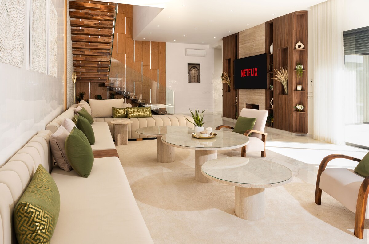 Suntuosa villa en medio de un jardín paisajístico de 3000 m² adornado con olivos centenarios y palmeras. 4 suites elegantes cada una con baño privado, vestidor, tv aire acondicionado y chimenea. Gran sala de estar luminosa que se abre a la piscina y al jardín, cocina equipada, gimnasio y terrazas que ofrecen impresionantes vistas a la piscina Atlas, zona de barbacoa y zona de comedor al aire libre para momentos inolvidables. Limpieza impecable. Ropa de cama ofrecida.