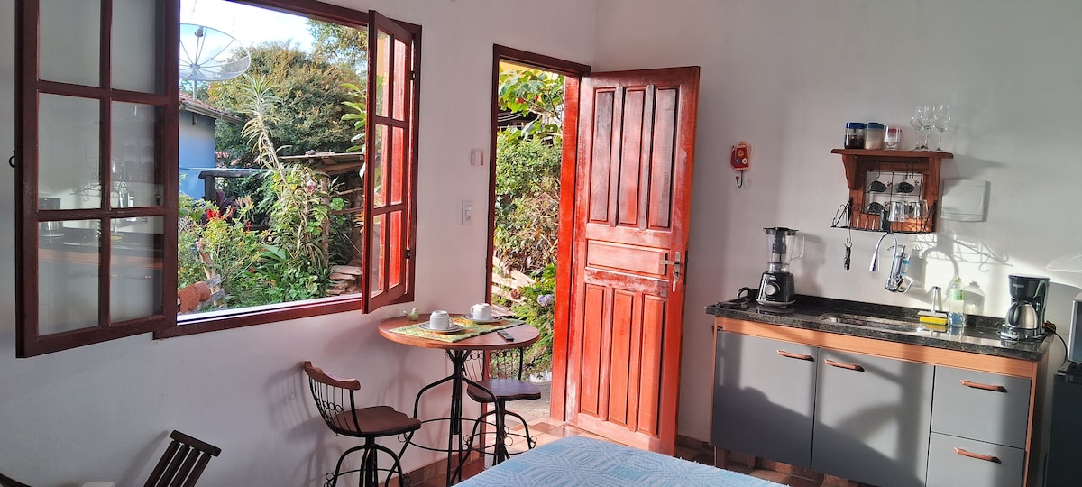 Gudhu, es un tipo de chalet. Suite equipada con cocina, NEVERA, SANDWICHERA, MICROONDAS, PENELA ELÉT. DE ARROZ, HERVIDOR ELÉT.el edificio, TERMO, utensilios de comida, ropa de cama y baños. La suite tiene una entrada independiente y otra entrada COMPARTIDA junto a un espacio de estacionamiento que se COMPARTE con más personas. Uno puede estacionar frente al espacio si lo encuentra conveniente. Ven a ver este increíble espacio, con una hermosa vista de la Serra do Caraça, pista de senderismo...