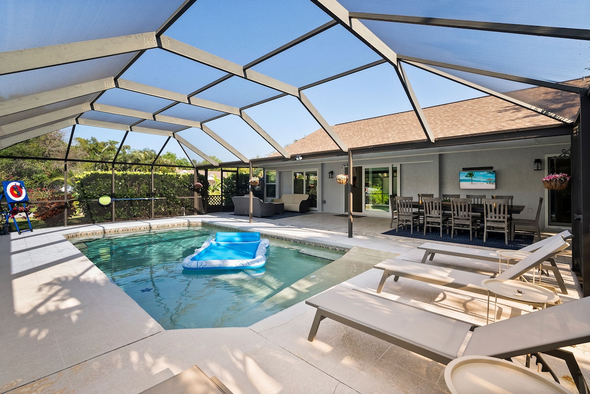 ¡Escápate al oasis privado en el corazón de Nápoles! → Bienvenido a 2,279 pies cuadrados de muebles modernos y elegantes. A → minutos de la Quinta Avenida, Tin City, la playa, el zoológico y el muelle. Cocina → totalmente equipada apta para el chef que llevas dentro. → Cena y relájate junto a la piscina en el lanai cerrado. → Date un chapuzón en la piscina climatizada y el spa. A los maestros de la→ parrilla les encantará la cocina al aire libre y los altavoces bluetooth. ¡→ Haz clic en el ❤ para añadir el anuncio a tu lista de deseos!