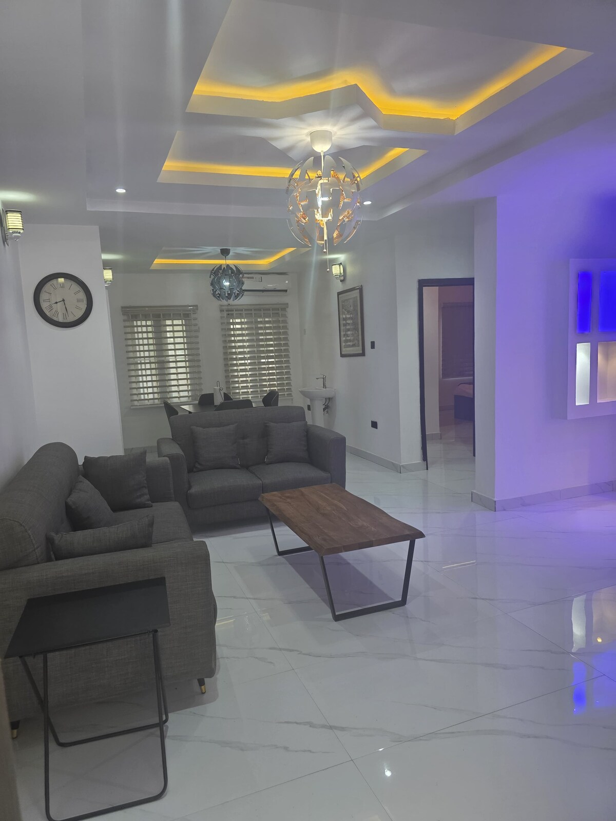 Este acogedor apartamento cuenta con un dormitorio con armario elegante y ventiladores. Sala de estar con ventiladores de aire acondicionado de televisión y lugar de trabajo. Cocina moderna equipada con cocina de gas, nevera, congelador, tostadora, utensilios de cocina y microondas. Baño con ducha situado en una comunidad cerrada y construido en un espacioso complejo cerrado con estacionamiento gratuito y reconocido suministro de seguridad para tres cámaras exteriores soportadas con luz de inundación. Fresco de energía solar las 24 horas con generador de 40 KVA.