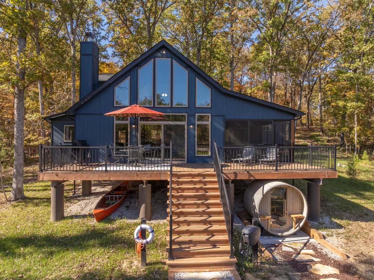 Ven a alojarte en «Redbird Cabin», nuestra casa de estilo alpino de 3 dormitorios frente al lago, justo en el agua, con hermosas vistas al lago desde la sala de estar. Tenemos mucho espacio para familias y amigos con todo lo necesario para disfrutar de tu retiro. Nuestra enorme área al aire libre es un gran espacio para hacer barbacoas, relajarse y sentarse junto a la hoguera. Ubicado en una comunidad cerrada dentro del centro vacacional Innsbrook (a una hora de STL), ¡te encantará la piscina comunitaria de temporada, el restaurante, el campo de golf, el gimnasio, el parque infantil y las rutas de senderismo!