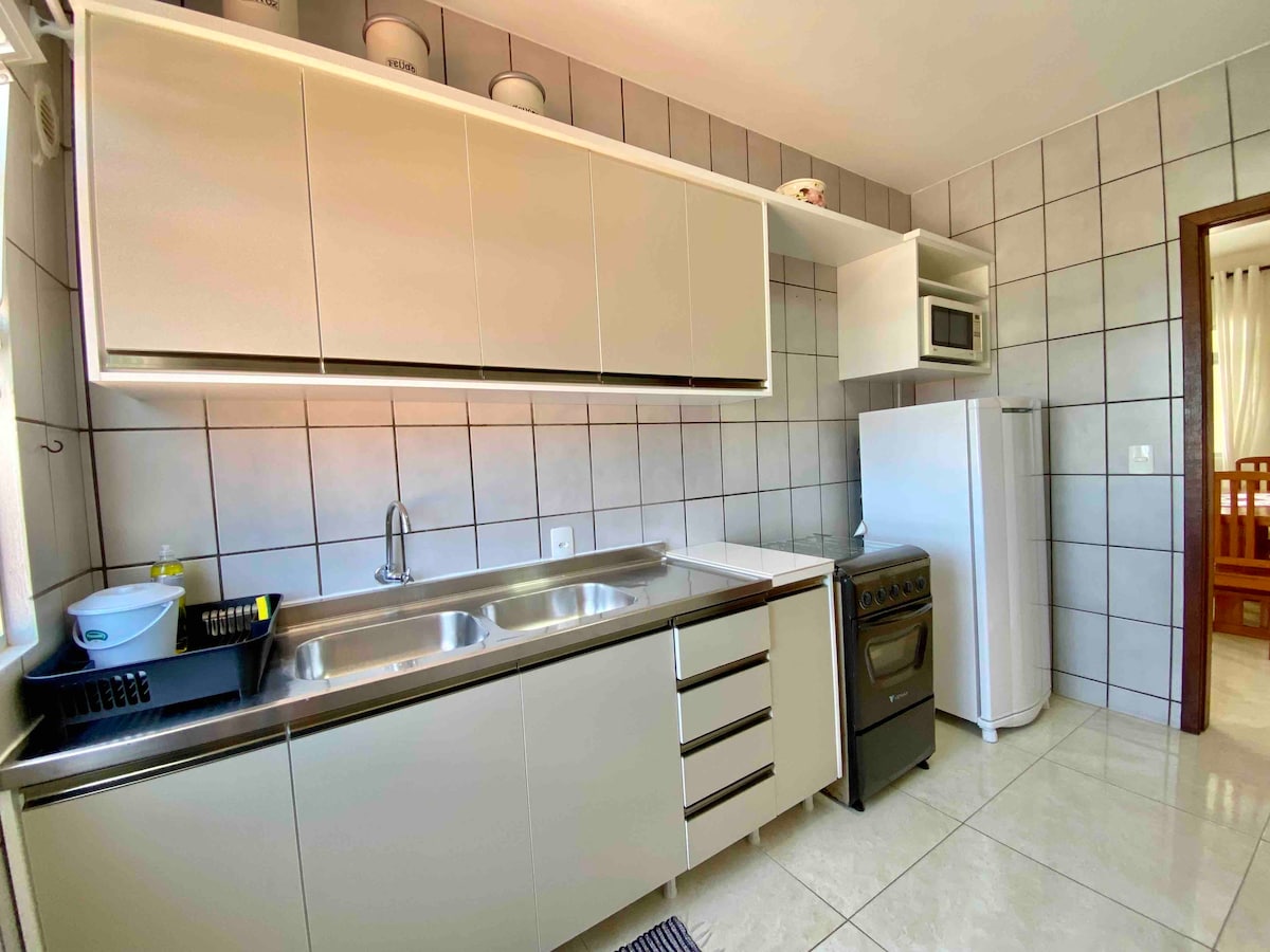 Apartamento com dois dormitórios todos dois com ar condicionado split, churrasqueira, estacionamento para um automóvel em pátio murado é fechado, cozinha equipada com utensílios básicos para o preparo e serviço de refeições, liquidificador, microondas, ferro de passar, sanduicheira, tv,excelente localização ( 3minutos da praia)