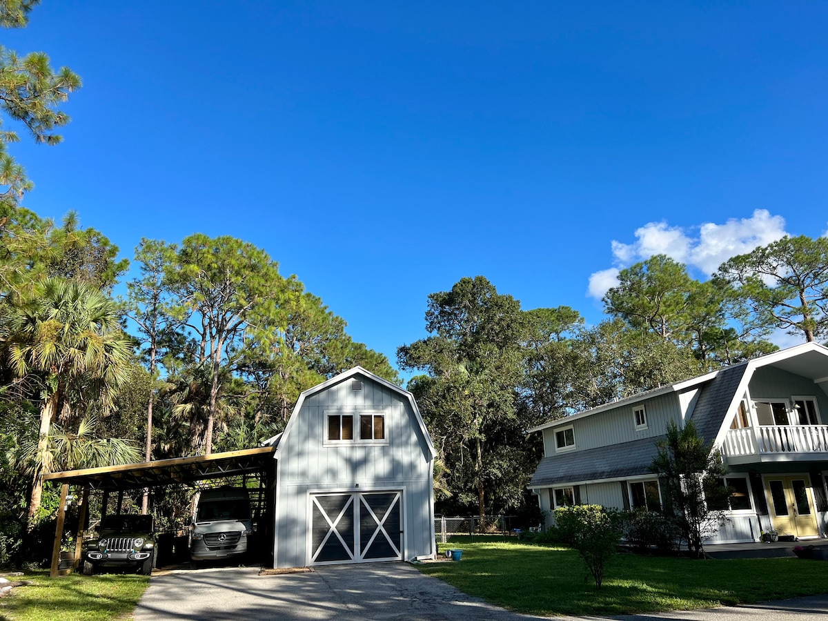 Come enjoy peace and harmony at our private wooded property located five minutes from highway 95 and Florida's Turnpike and 15 minutes from gorgeous beaches. Across the street from Burt Reynolds' old ranch (and Al Capone hideaway), Burt and friends used the space for poker and to hang. If you don't care about history, you'll still love the bedroom with green tea memory foam mattress, bathroom, fully appointed kitchen, washer/dryer, and living room with a daybed that converts to 2 twin trundles.