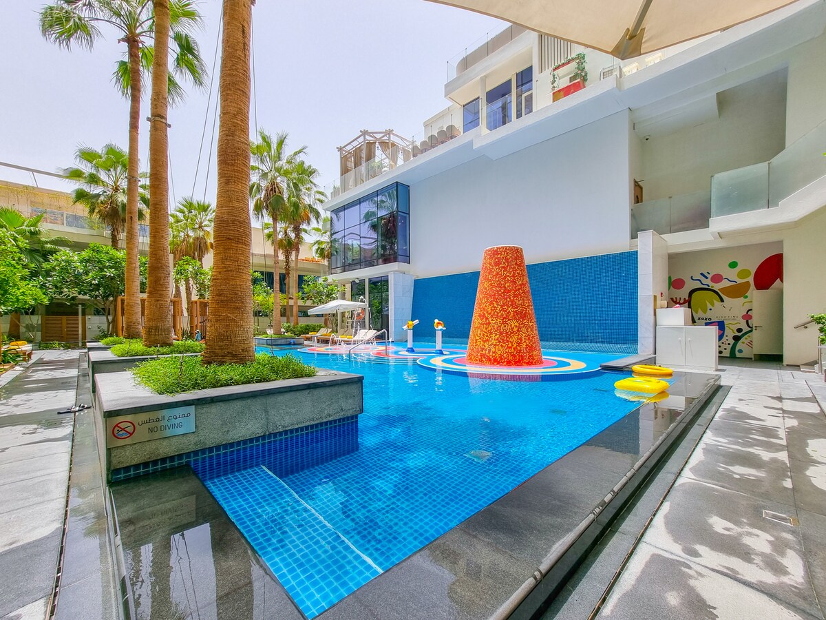 Nuestro departamento familiar de 1 dormitorio cuidadosamente diseñado se encuentra en el corazón de Palm Jumeirah de Dubái, justo enfrente del famoso centro comercial Nakheel. El apartamento tiene una cocina totalmente equipada y está situado dentro de un hotel de estilo de vida completo de 5 estrellas, el Andaz Dubai The Palm by Hyatt. El apartamento te ofrece acceso a una variedad de servicios, como acceso a la playa de la comunidad y a la piscina familiar con vistas al Burj Al Arab, varios restaurantes y áreas de relajación solo para adultos (Ora Spa).