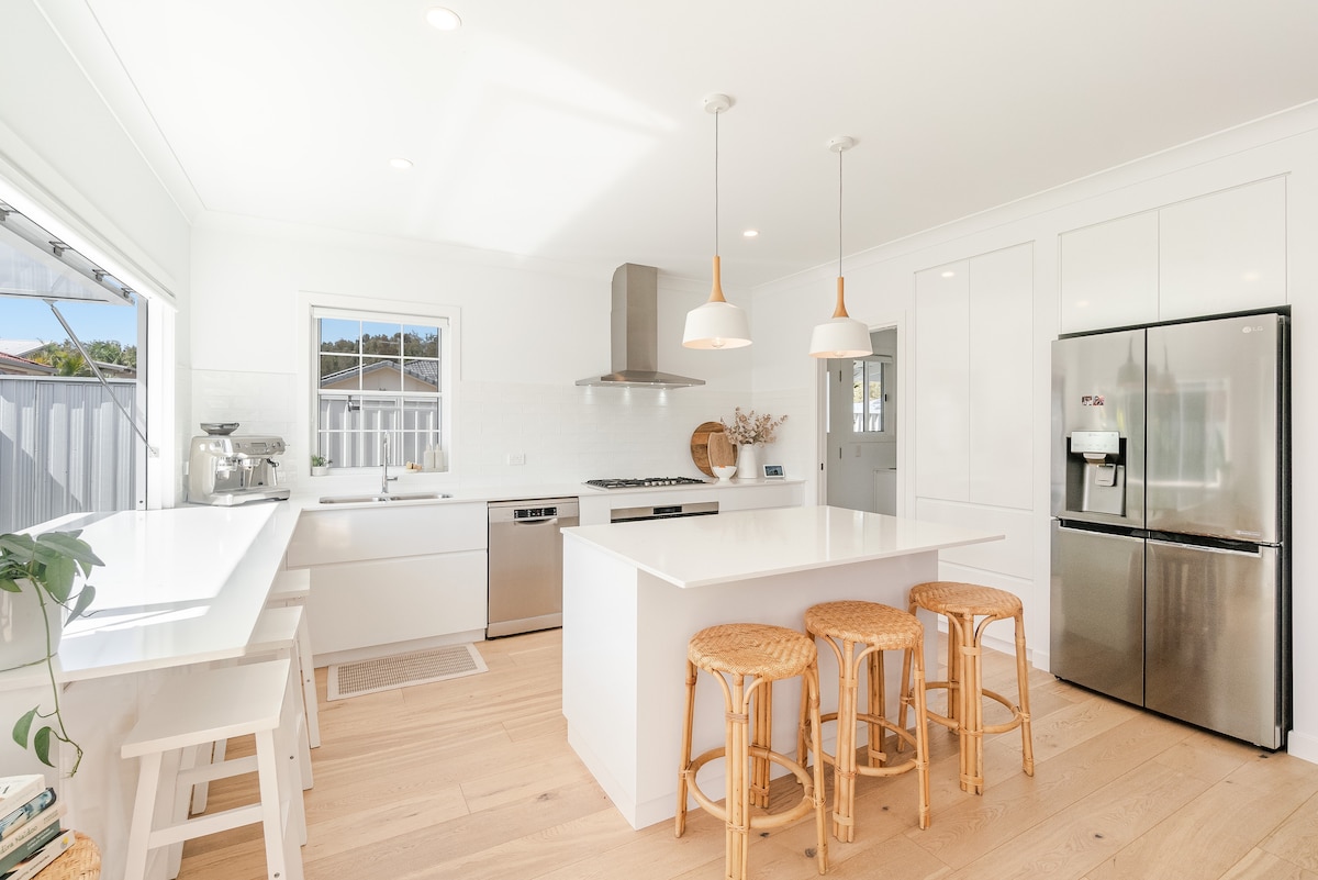 Amplio apartamento de tres dormitorios con piscina diseñado meticulosamente para crear tu hogar lejos de casa. A pocos pasos de la playa, esta casa cuenta con una gran terraza delantera con vistas al mar y un patio trasero con asientos incorporados y una pérgola sombreada para relajarse alrededor de la piscina. Todos los lujos que uno necesitaría... cafetera Nespresso, wifi, TV inteligente, equipo de música Bang and Olsen con bluetooth y una ducha caliente al aire libre. Casa perfecta para dos familias o una familia numerosa.