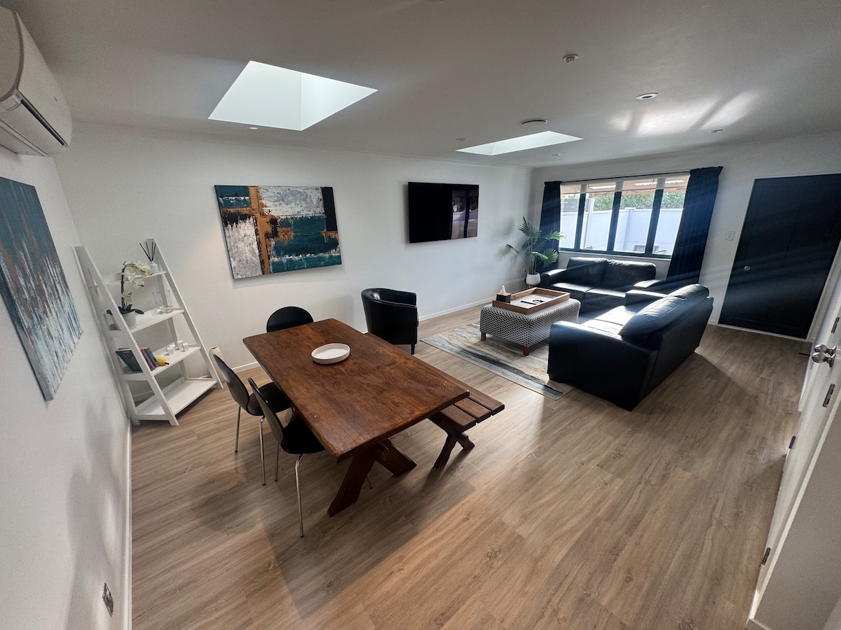 Apartamento privado independiente con dos dormitorios, sala de estar de planta abierta, comedor, cocina pequeña y baño. Dormitorio principal con cama tamaño queen. El segundo dormitorio se puede utilizar como dormitorio o como oficina independiente. Cuna portátil disponible. Grandes ventanales del suelo al techo y puerta corredera en la sala de estar que se abre a un patio privado cerrado con barbacoa. El apartamento tiene bomba de calor, está totalmente aislado y tiene doble acristalamiento en todas partes. La televisión tiene NZ Freeview. Acceso a Internet inalámbrico y por cable en todas partes.